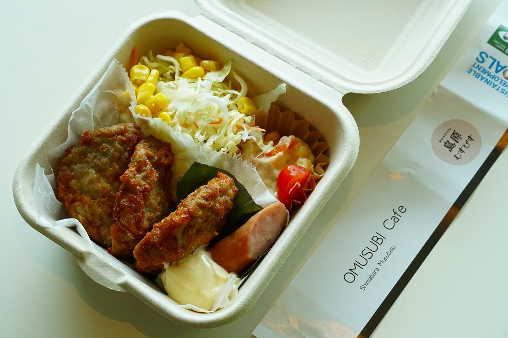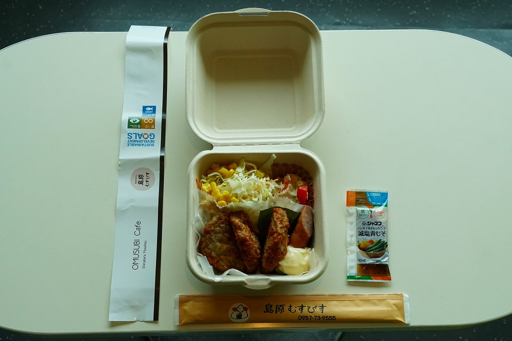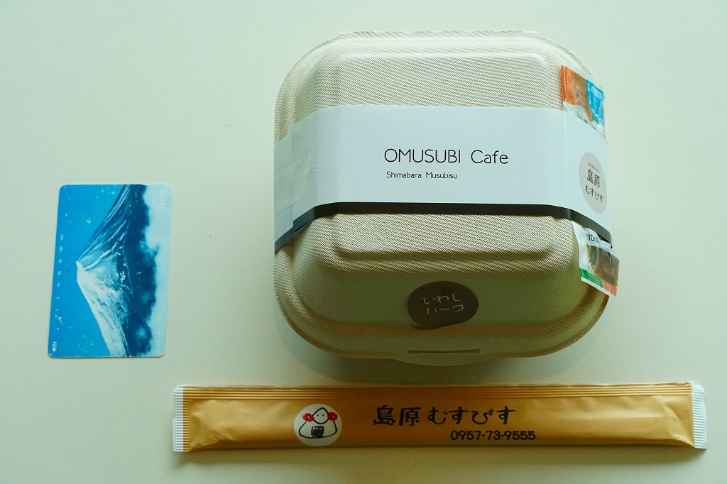 島原鉄道の島原駅の裏手にある商店「島原むすびす」で購入。この「おむすびカフェ」を名乗る店舗は、島原鉄道の島原駅弁を名乗り、2023年10月のJR九州の駅弁キャンペーン「第13回九州駅弁グランプリ」に「火山弁当」(500円)を、翌2024年10月の「第14回九州駅弁グランプリ」に「風光明媚火山弁当」(1,000円)をエントリーした。午前中の訪問で弁当は完売しており、代わりにこれを購入したもの。