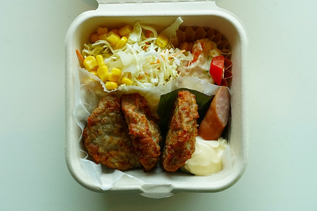 母恋駅や七戸十和田駅など、ハンバーガーやサンドイッチでも入っていそうな、既存の駅弁屋では使われないタイプのふた付き容器に、いわしハンバーグと千切りキャベルサラダなどを詰めていた。こういうものが、カフェめしというのだろう。弁当のように見えて、御飯は入らないお惣菜。