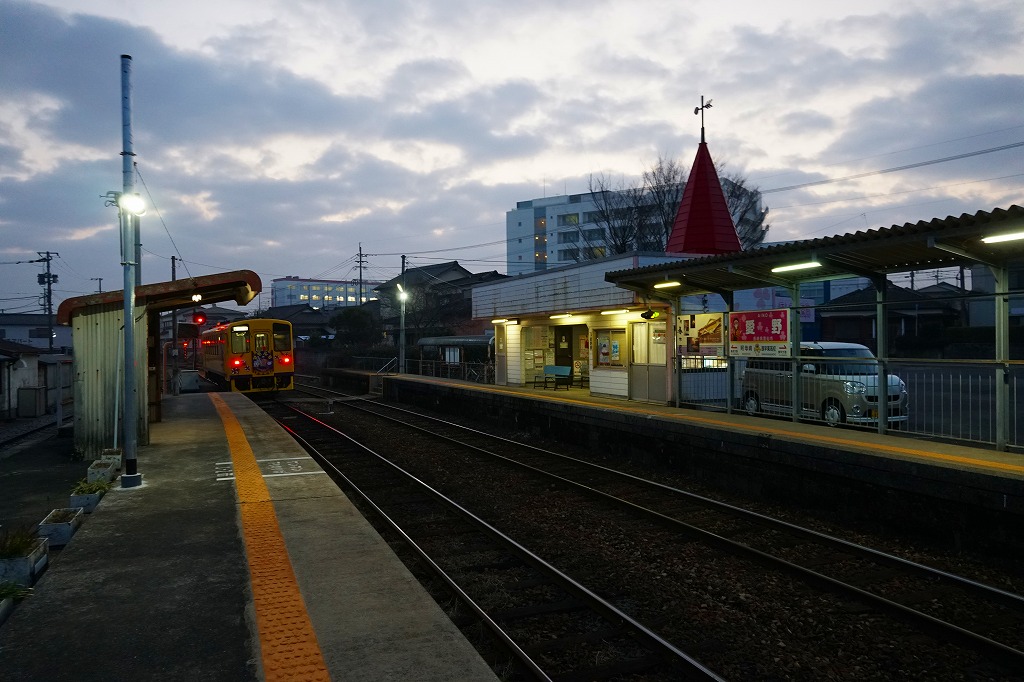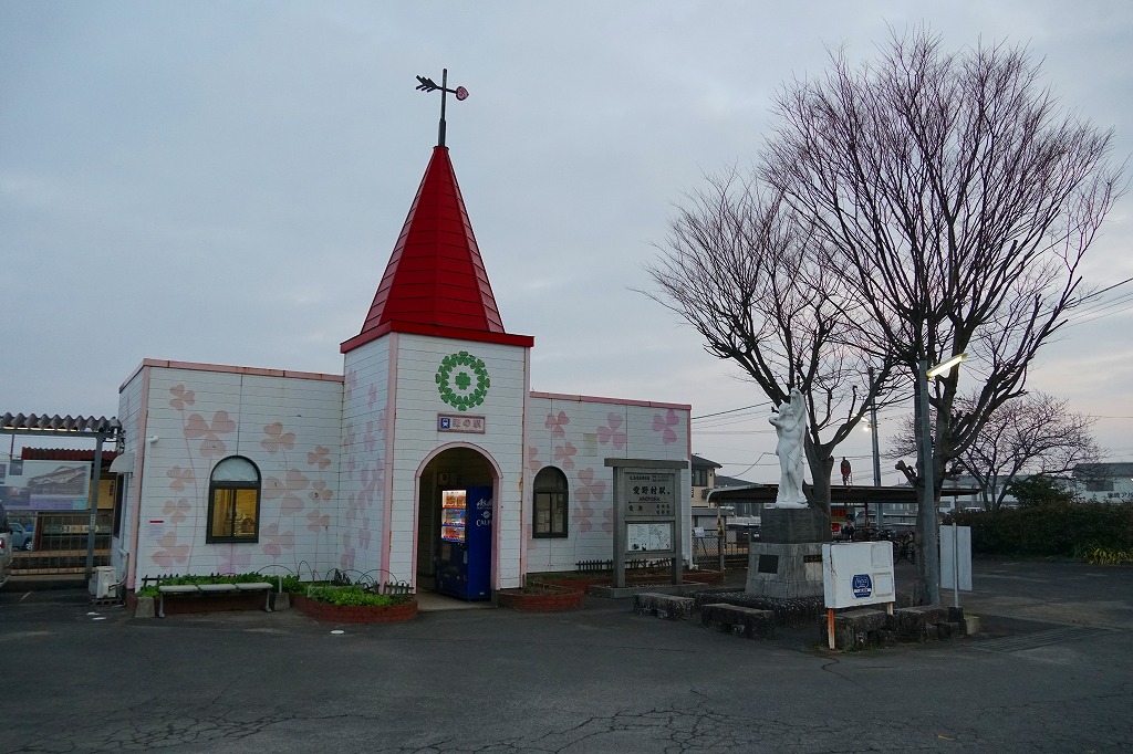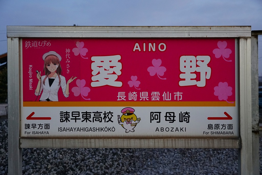 諫早駅から島原鉄道で約25分。雲仙市は長崎県の島原半島の西半分を占める、2005年の6町合併でできた人口約4万人の市。愛野町はそのうち島原半島の付け根に位置した人口約5千人の町で、交通の要衝とジャガイモの生産で知られた諫早のベッドタウン。当時市販の鉄道時刻表によると、1920年前後にこの駅で駅弁が売られたという。1911(明治44)年6月20日開業、長崎県雲仙市愛野町甲。