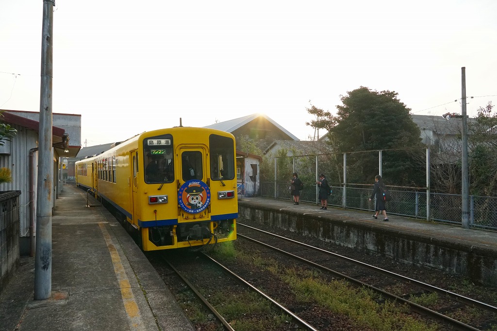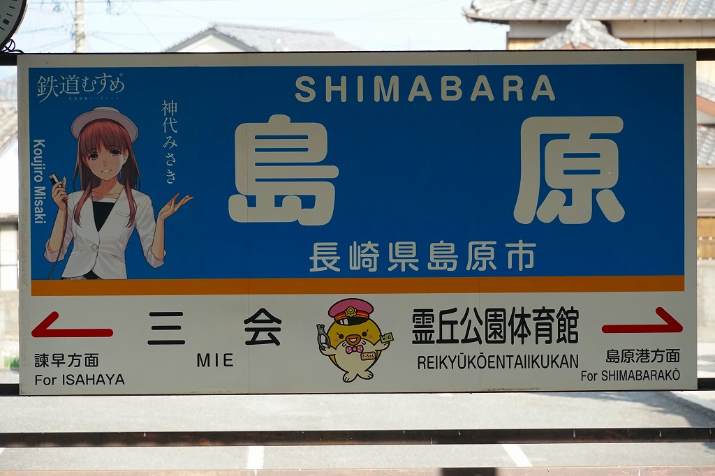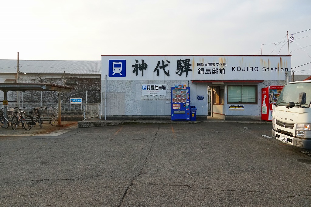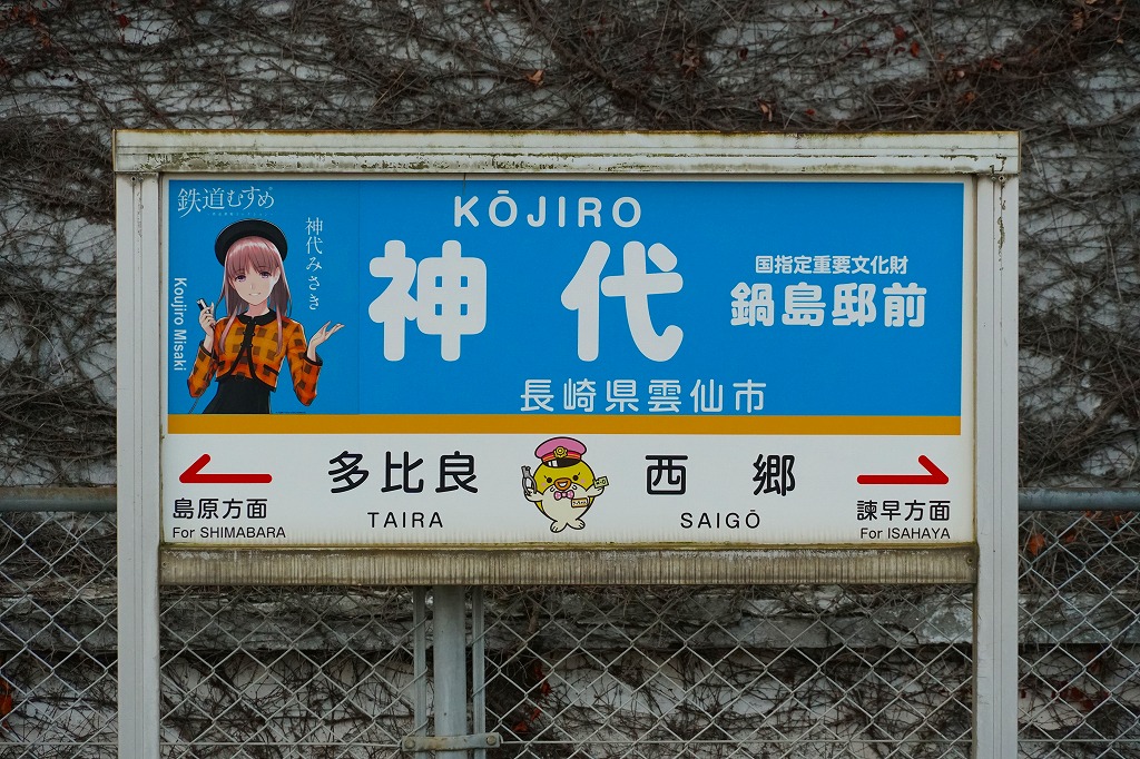 諫早駅から島原鉄道で約50分。有明海に神代川が注ぐこの地には、江戸時代に鶴亀城鍋島氏の城下町があり、武家屋敷群や陣屋跡の邸宅が2005年に国の重要伝統的建造物群保存地区に選定された。当時市販の鉄道時刻表によると、1920年代にこの駅で駅弁が売られたという。1912(大正元)年10月10日開業、 長崎県雲仙市国見町神代乙。