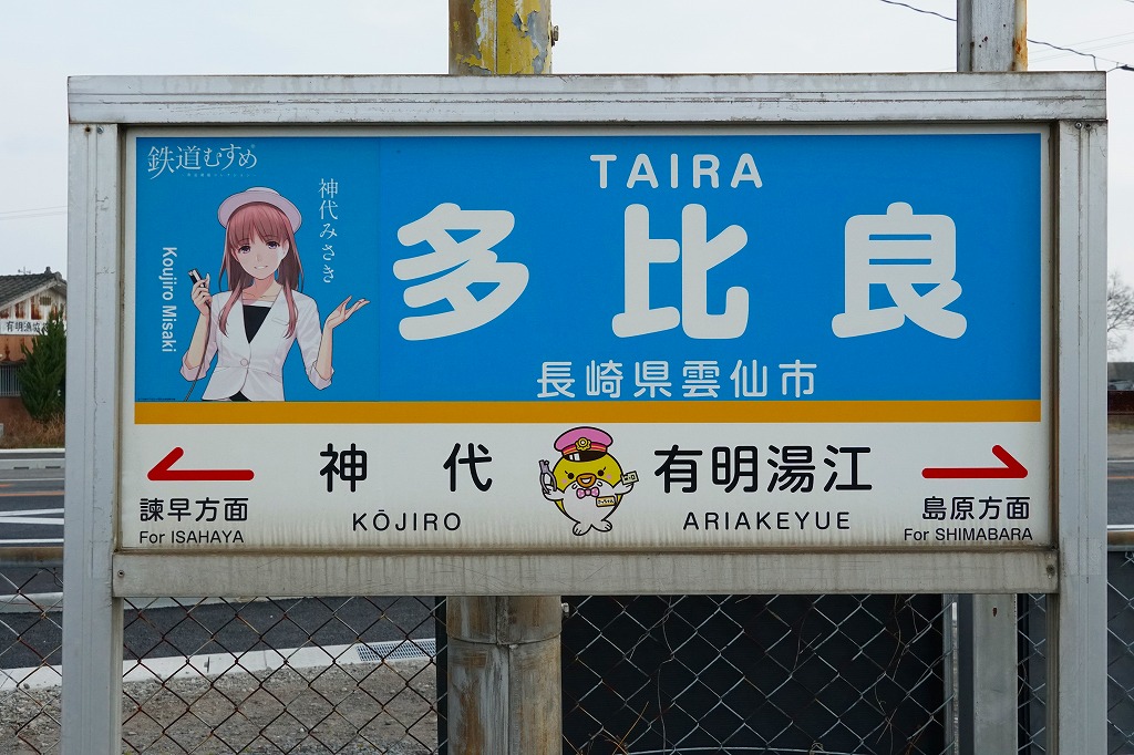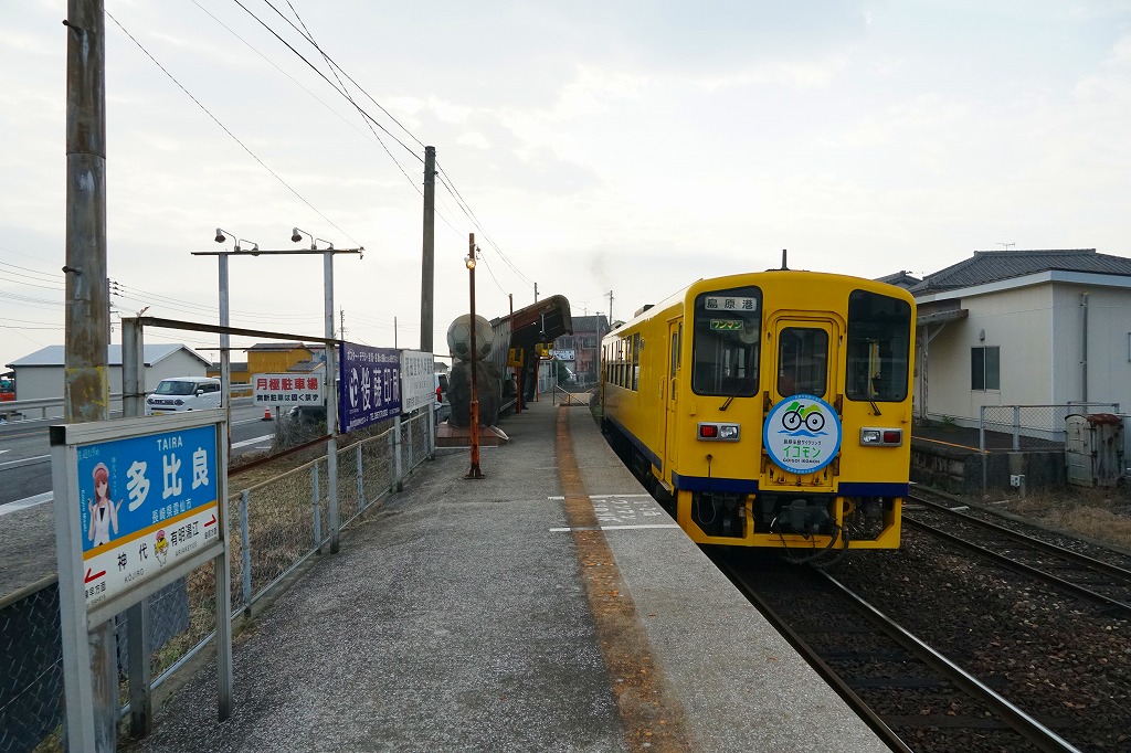 諫早駅から島原鉄道で約50分。2019年まで多比良町(たいらまち)駅。雲仙市は長崎県の島原半島の西半分を占める、2005年の6町合併でできた人口約4万人の市。うち国見町は半島の北端で川沿いに雲仙岳までのびた人口約1万人の町で、対岸の熊本県長洲とフェリーで結ばれるほか、高校サッカーの強豪校で知られた。当時市販の鉄道時刻表によると1920年前後に駅弁が売られたらしい。1913(大正2)年5月10日開業、長崎県雲仙市国見町多比良乙。