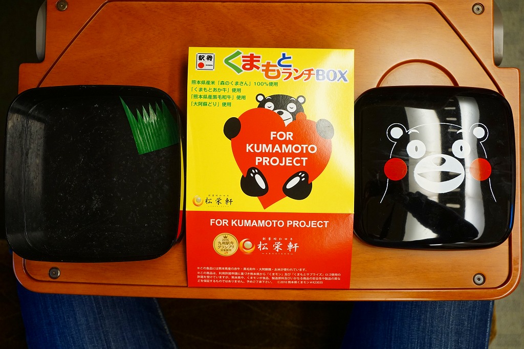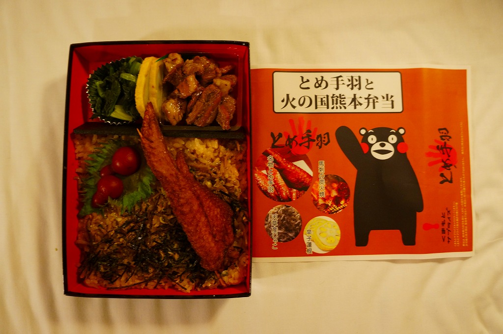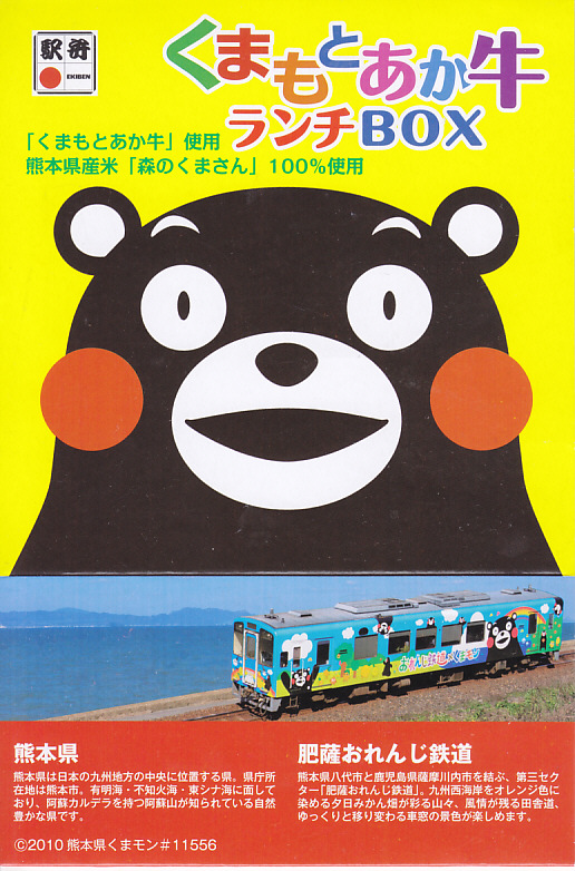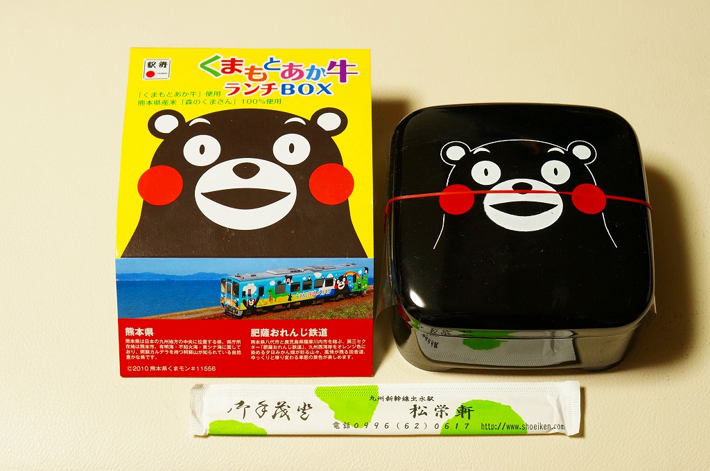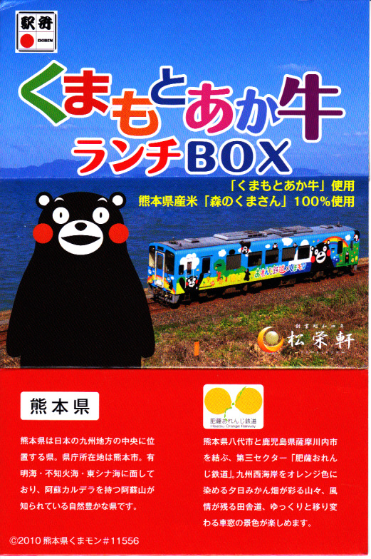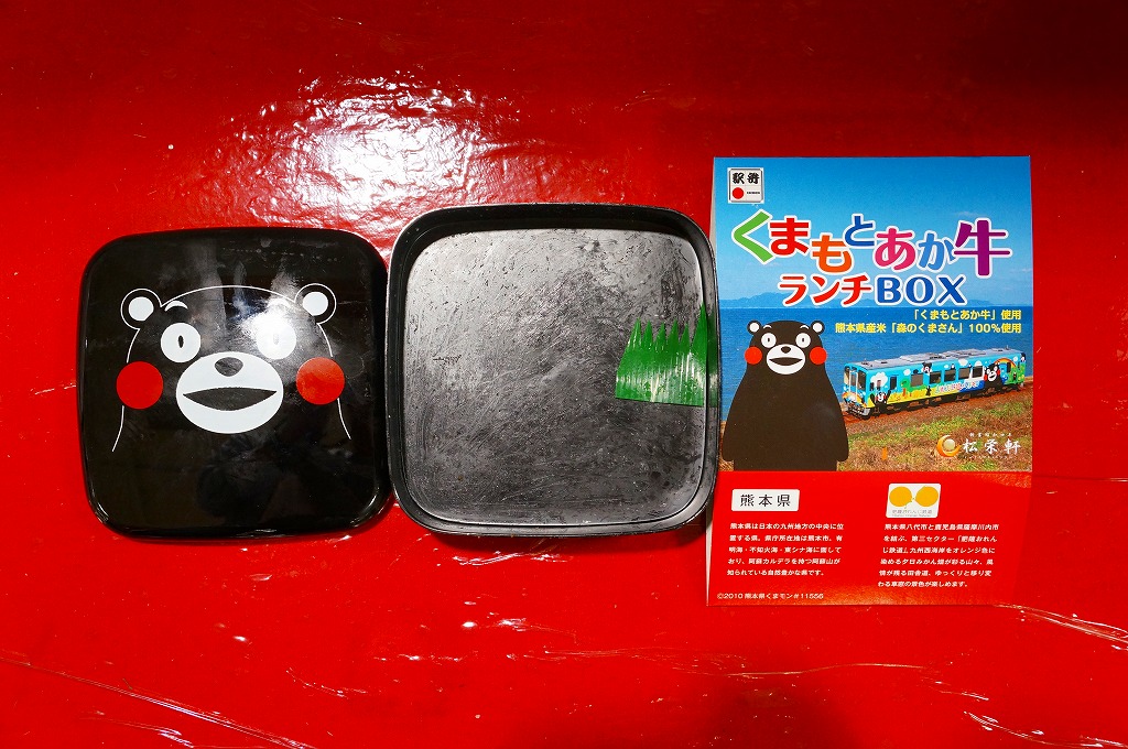 熊本県のキャラクター「くまモン」を描いた真っ黒なプラスティック製容器に、熊本県産米「森のくまさん」の味付飯を詰め、くまもとあか牛の牛肉煮で覆い、ゆで卵、レンコン酢漬け、きんぴらごぼう、高菜漬、ドライかぼちゃとドライにんじんを添える。つまり牛丼駅弁。輸送の影響か、飯も肉もパサパサで、褐毛和種の豊かな赤身の味はどこにもなかった。
