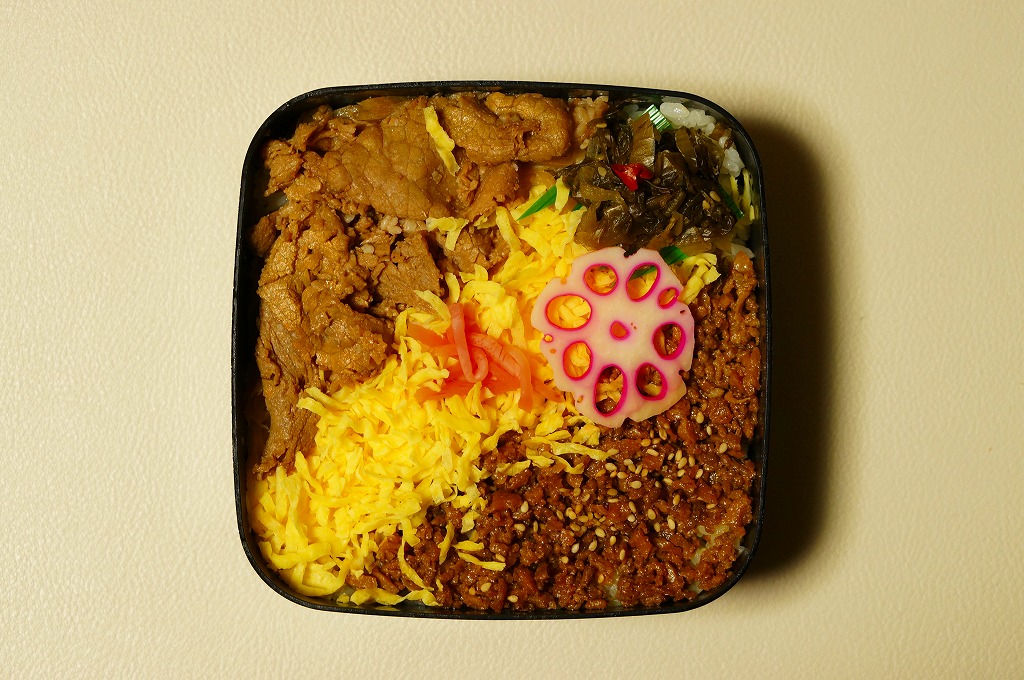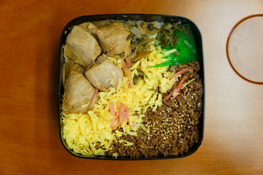 熊本県のキャラクター「くまモン」を描くプラスティック製の黒い容器をそのままに、パッケージのデザインをまた変えて、中身は茶飯を牛そぼろと錦糸卵と鶏照焼と高菜などで覆う、つまり牛肉煮を鶏照焼に替えただけ。その熊本県産「大阿蘇どり」は、照焼というよりはむしろ煮付けで、焼鳥サイズのサクサク、ボソボソした肉片は、そこそこあっさり。