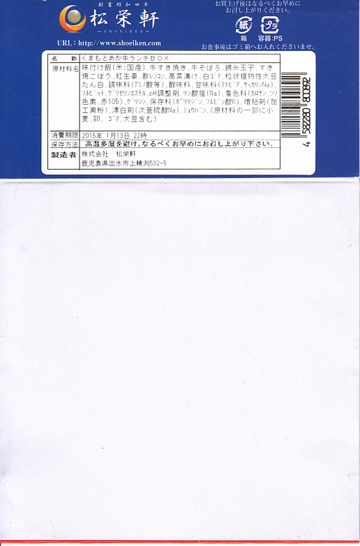 熊本駅弁「くまもとあか牛ランチBOX」の、2015年時点での姿。くまモンのプラスティック製容器をそのままに、パッケージの絵柄でくまモンが大きくなり、肥薩おれんじ鉄道の写真は上面から側面へ追いやられ、中身の牛肉は小さくなった。御飯の上に、牛すき焼き、錦糸卵、牛そぼろでストライプを描き、高菜漬、酢レンコン、紅生姜を添える。