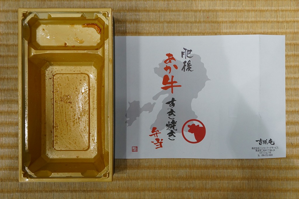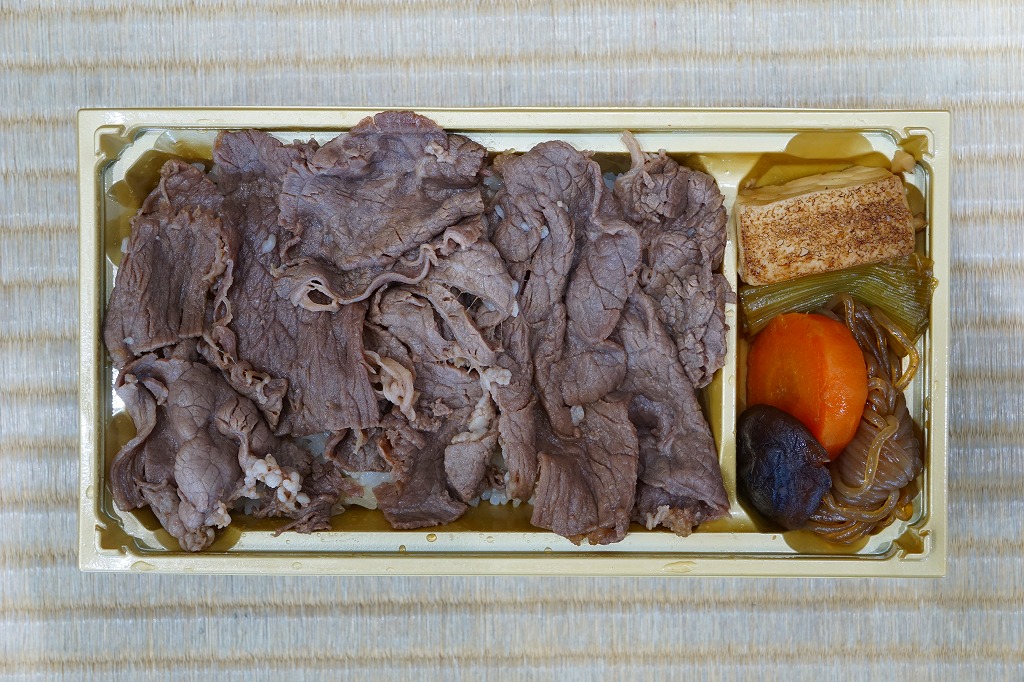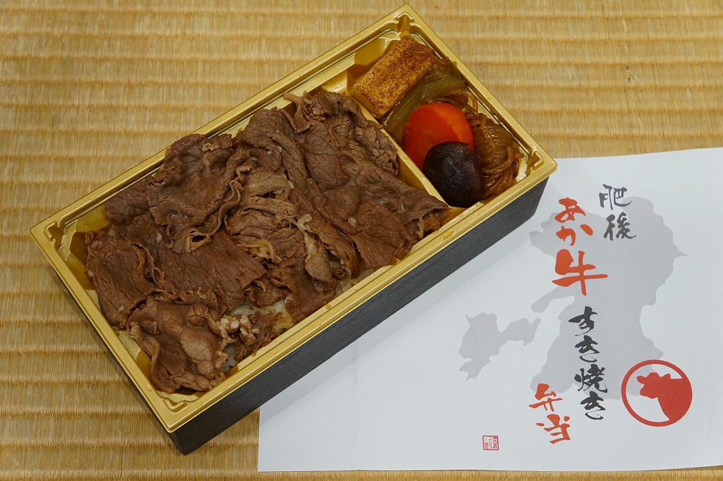JR九州の駅弁キャンペーン「第12回九州駅弁グランプリ」へのエントリーに合わせ、2016(平成28)年10月の発売か。長方形の容器に白御飯を詰め、牛肉煮を載せ、焼き豆腐、ニンジン、シイタケ、青ネギ、糸こんにゃくなどを添える。つまり、すき焼きの肉と具を別に詰める。牛肉が他の駅弁のようにシワシワでなく、薄く平たいものが多く混じり、牛肉煮なのにサクサク、ボソボソした味を感じる個性作。味付けでなく肉質で、飯のおかずによく合う。調製元の駅からの撤退により、2018年3月頃までに終売か。
