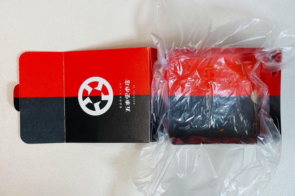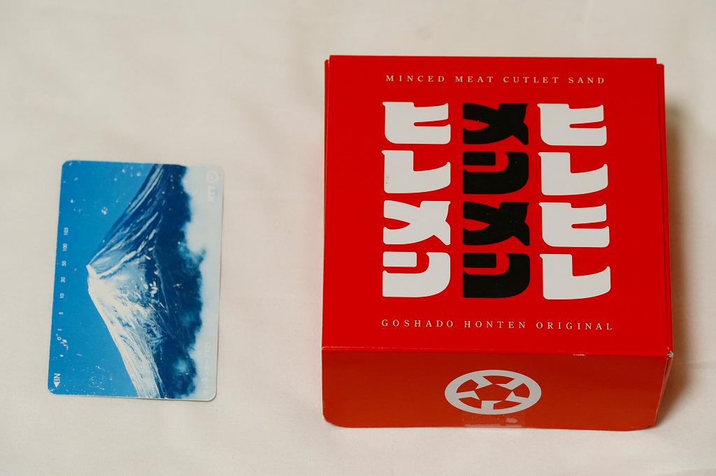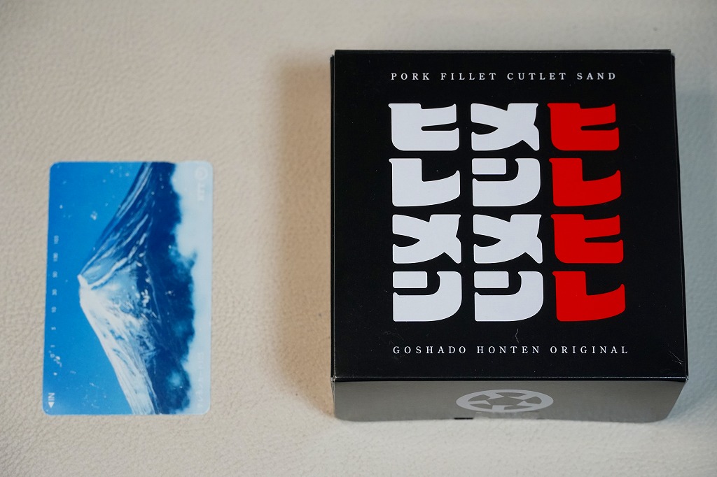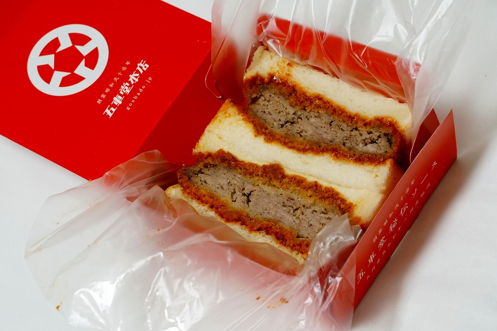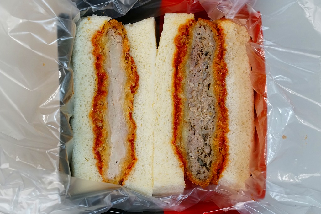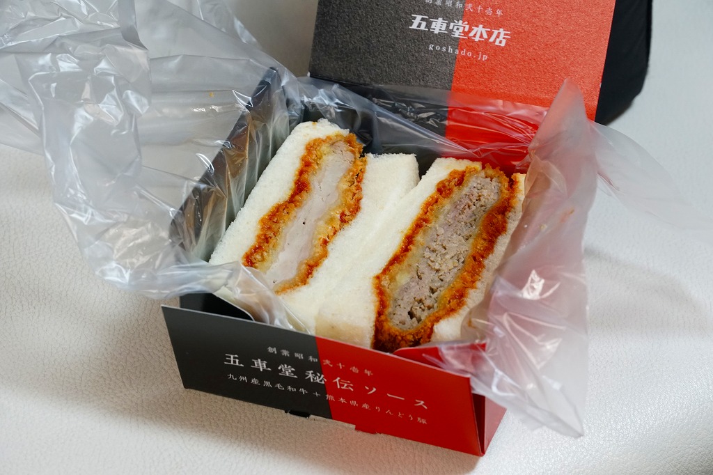 熊本駅のファミリーマートでは、2022(令和4)年5月までに発売か。熊本駅から徒歩2分のステーキとハンバーグのレストラン「五車堂」(ごしゃどう)のカツサンドが、熊本駅の駅弁売り場へ派手に進出した。商品名は赤文字の「ヒレメン」だろうか。英字で「FILLET&MINCED CUTLET SAND」、食品表示で「調理パン(ヒレカツサンド・メンチカツサンド)」とある。この黒と赤の紙箱に、ヒレカツとメンチカツのソース漬けを耳なし食パンで挟んだカツサンドが、1切れずつ収まる。このソースが、五車堂が創業以来70年以上にわたり大切に作り続けてきた秘伝なんだとか。価格は駅では630円、ネット通販や店舗で買うと540円。