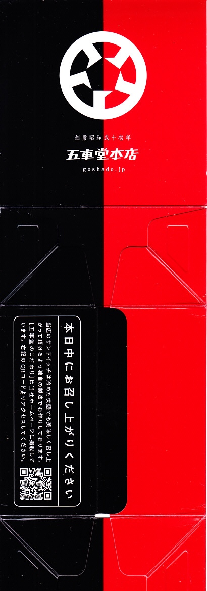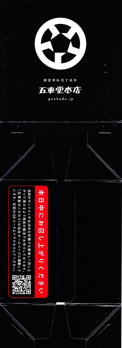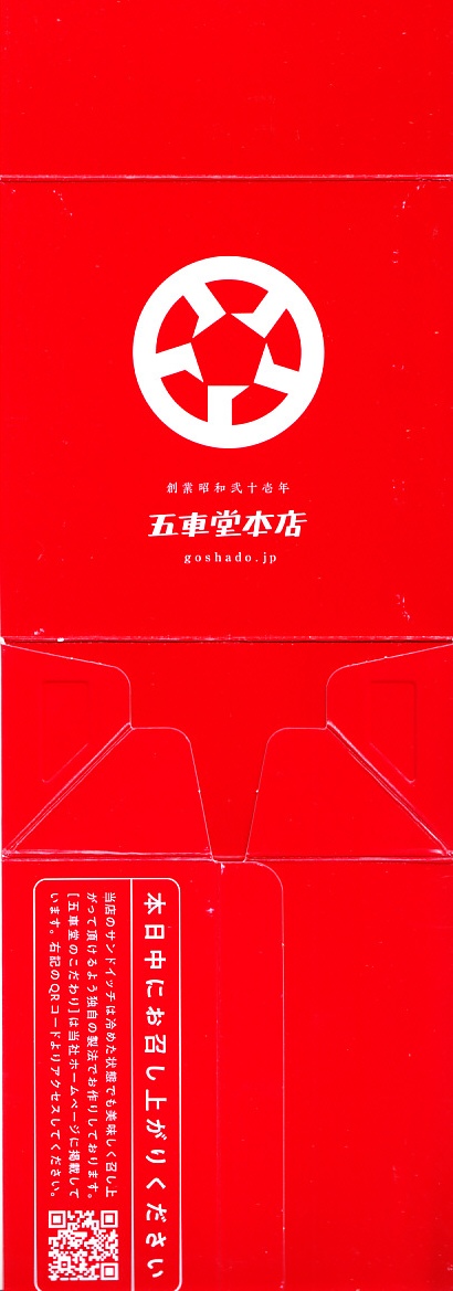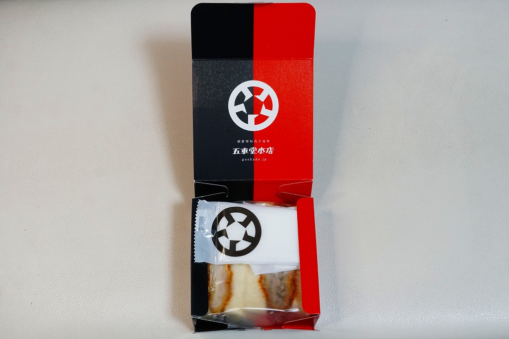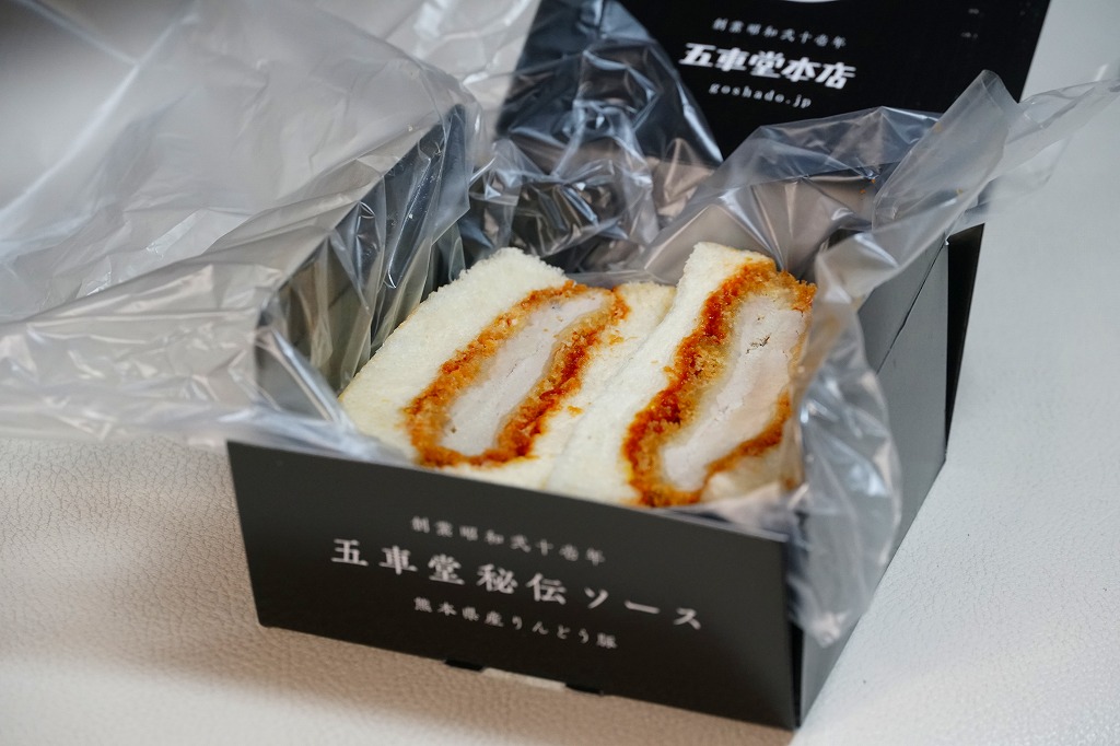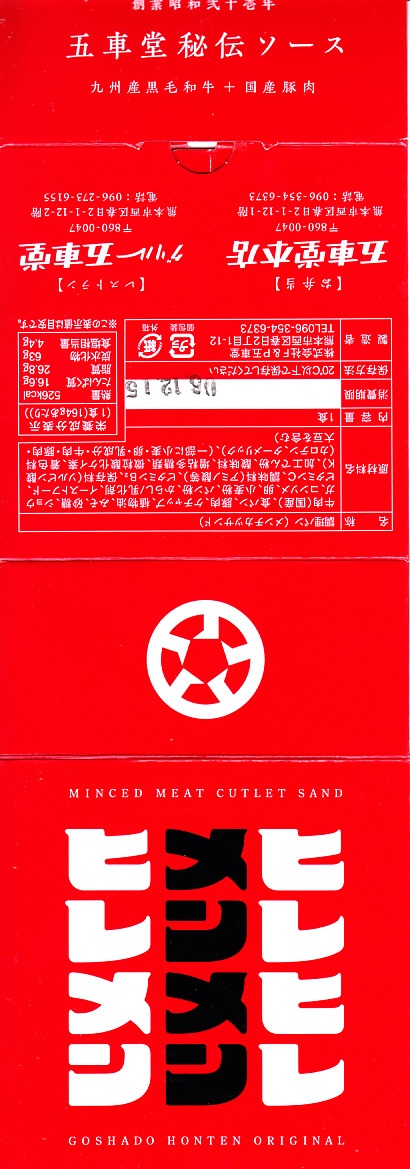 2023年末の熊本駅で初めて見たが、すでに上記の「ヒレヒレ」「ヒレメン」と一緒に発売か。英字で「MINCED MEAT CUTLET SAND」、食品表示で「調理パン(メンチカツサンド)」とある。この赤い紙箱に、メンチカツのソース漬けを耳なし食パンで挟んだカツサンドが2切れ収まる。このソースが、五車堂が創業以来70年以上にわたり大切に作り続けてきた秘伝なんだとか。価格は駅では630円、ネット通販や店舗で買うと540円。