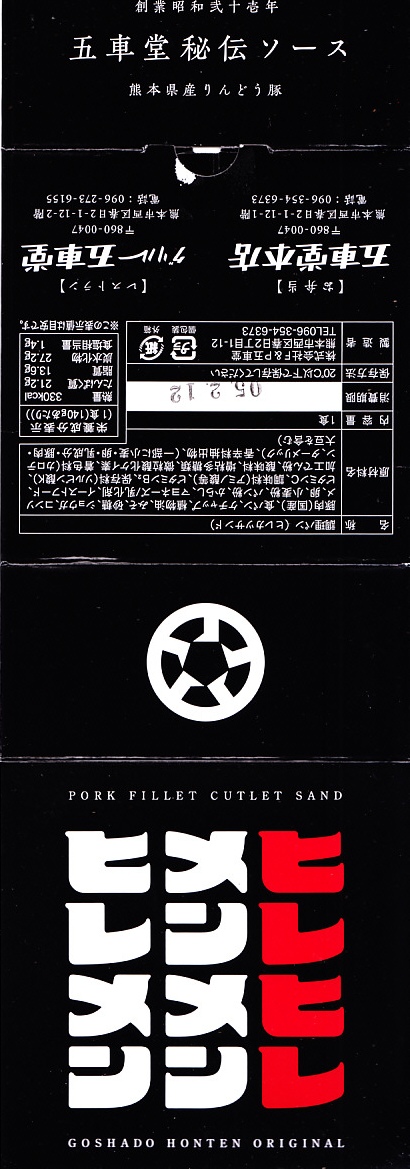 熊本駅のファミリーマートでは、2022(令和4)年5月までに発売か。熊本駅から徒歩2分のステーキとハンバーグのレストラン「五車堂」(ごしゃどう)のカツサンドが、熊本駅の駅弁売り場へ派手に進出した。商品名は赤文字の「ヒレヒレ」だろうか。英字で「PORK FILLET CUTLET SAND」、食品表示で「調理パン(ヒレカツサンド)」とある。この黒い紙箱に、ヒレカツのソース漬けを耳なし食パンで挟んだカツサンドが2切れだけ収まる。このソースが、五車堂が創業以来70年以上にわたり大切に作り続けてきた秘伝なんだとか。価格は駅では630円、ネット通販や店舗で買うと540円。