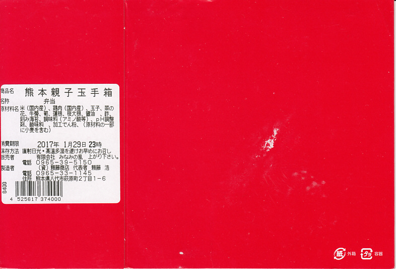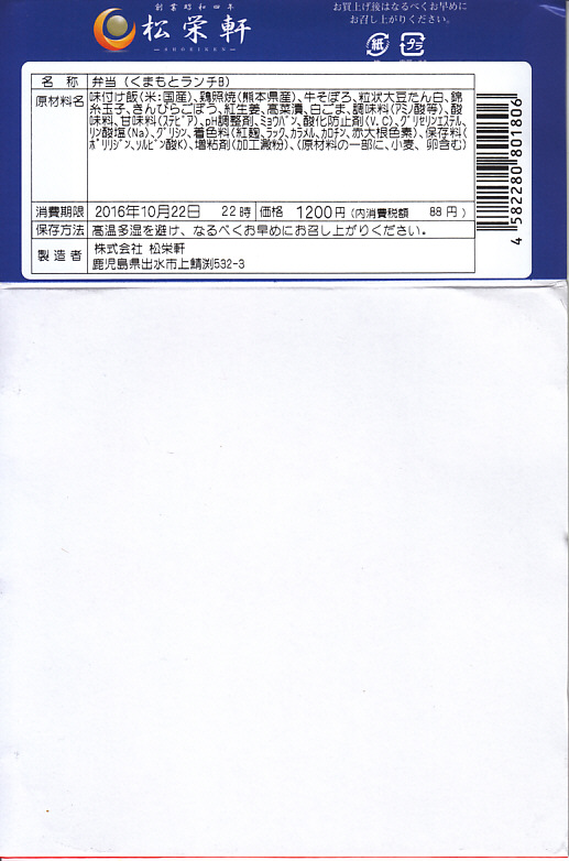 2016(平成28)年10月22日に購入した、熊本駅弁の掛紙。上記の1年半後と同じ。容器や中身や価格も同じ。当時の掛紙には、九州鉄道営業会「九州駅弁」と、JR九州「2016九州駅弁グランプリ」のロゴマークが貼られていた。