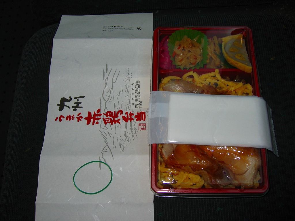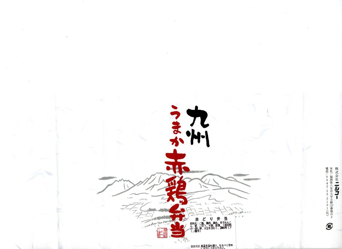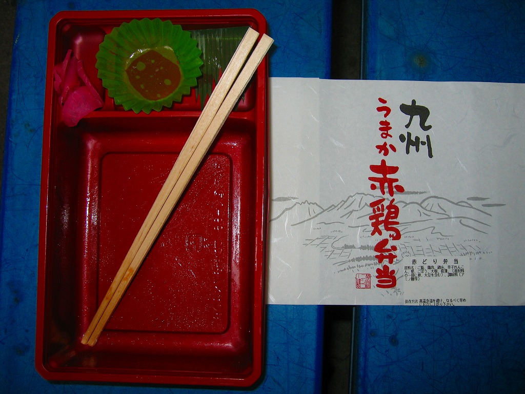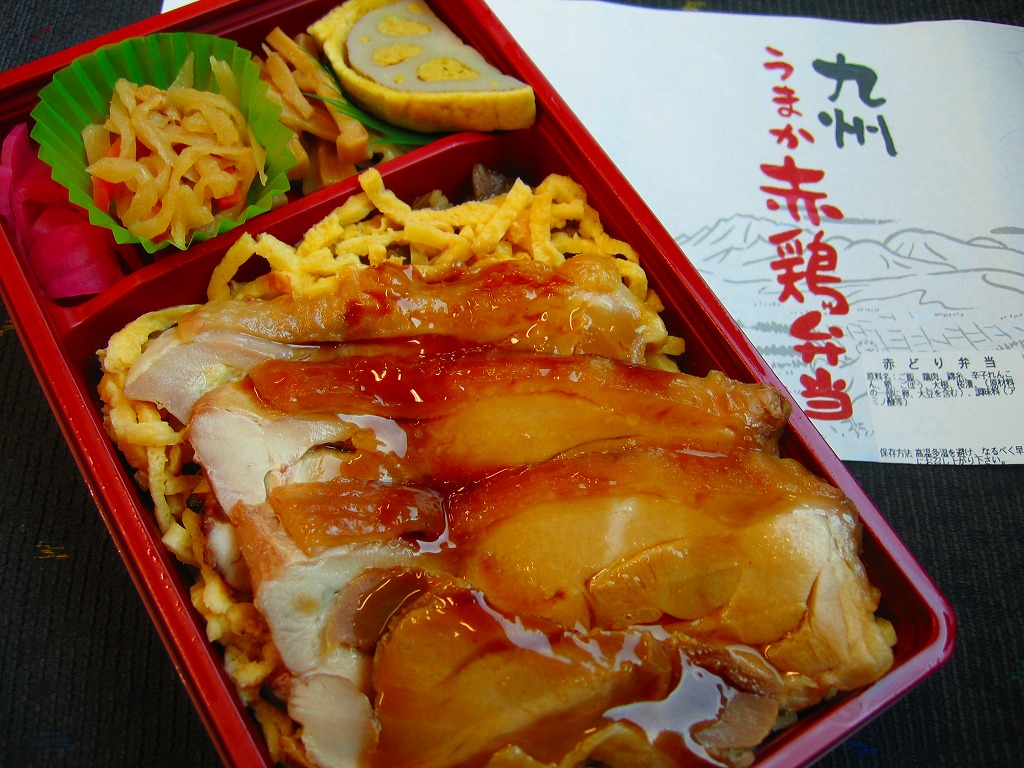 2008(平成20)年の10月までに発売。長方形のプラ製の惣菜容器に透明なふたをして輪ゴムで留め、商品名に阿蘇のような風景を描いた掛紙を巻き、テープと食品表示ラベルで留める。中身は茶飯の上を太い錦糸卵で覆い、鶏照焼のスライスをふんだんに載せて、辛子れんこん、切り干し大根、桜漬などを添えるもの。柔らかさと締まりが程良い、具だくさんでなかなかうまい鶏肉弁当。価格は2009年の購入時で820円、2016年時点で1,000円。