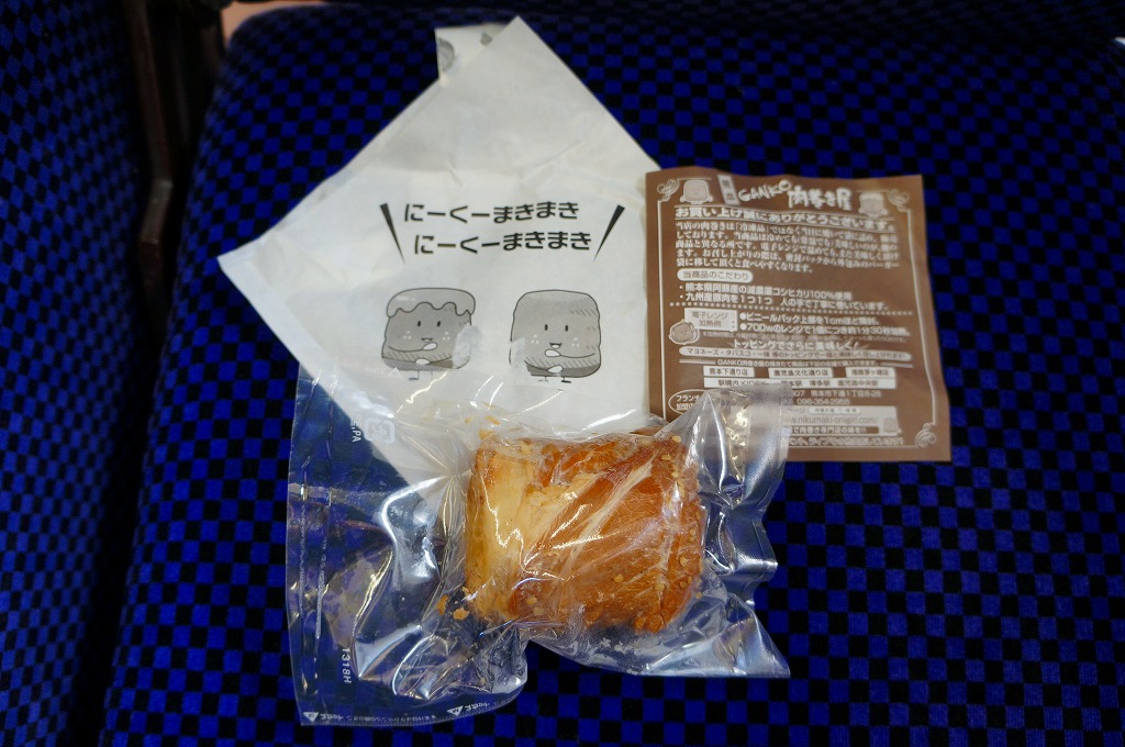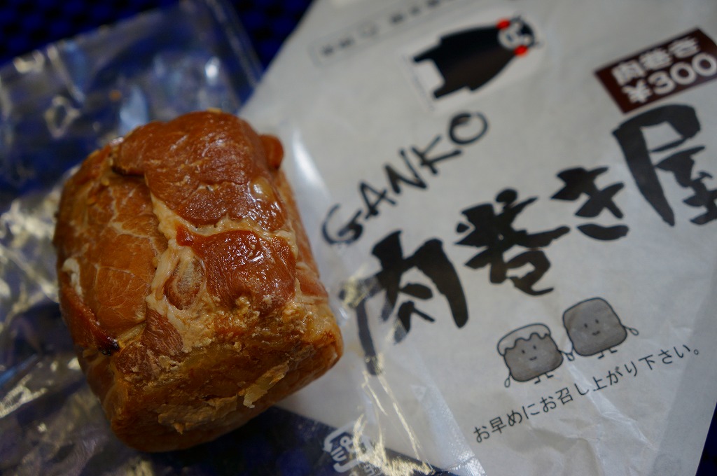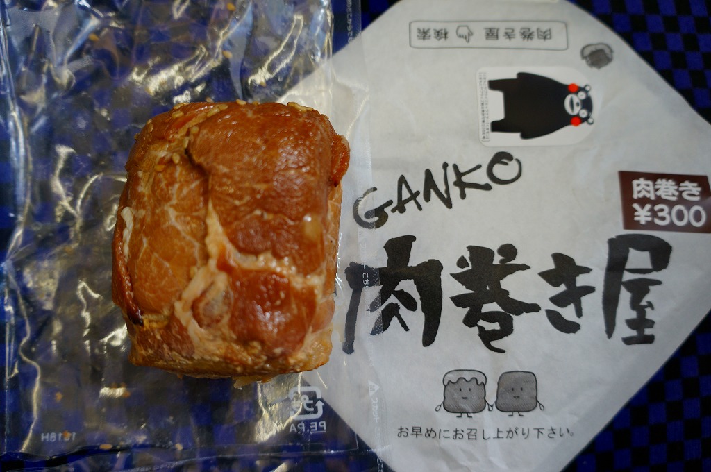 新幹線熊本駅の床置き形キヨスクで、八代駅の駅弁とともに売られた商品。この「肉巻き」が通常版で、他に売店では「大葉入り肉巻き」が300円で、「チーズ肉巻き」が350円で販売されていた。市販の肉まんやハンバーガーと同じような包装紙に、熊本県阿蘇産の白御飯を九州産の豚肉で目張りしたおにぎりが、真空パックで1個収まる。空弁でも何度か出会っている内容と味。包装紙に「くまモン」のシールまで貼り熊本をアピールするが、ブランドネームや商品そのものは神奈川や長野にもあるフランチャイズチェーンの製品。