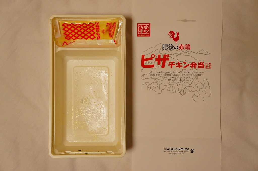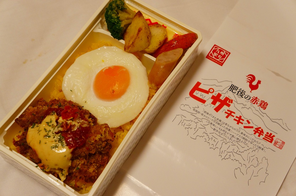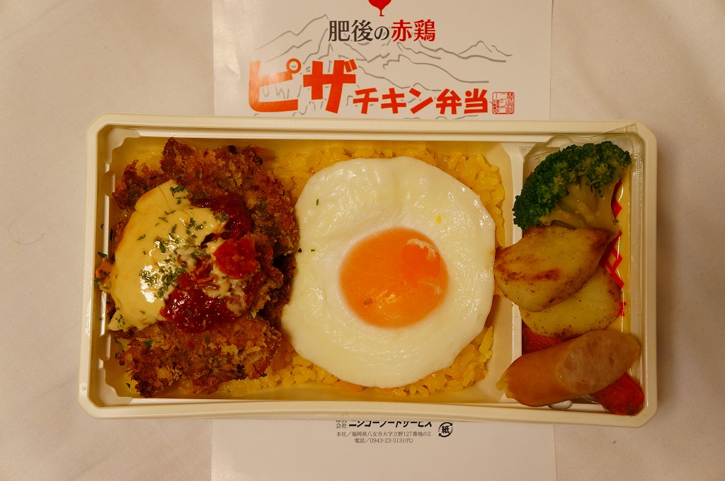 2013(平成25)年10月のJR九州の駅弁キャンペーン「第10回九州駅弁グランプリ」の開始に合わせて発売し、同キャンペーンにエントリー。サフランライスをピザチキンと目玉焼きで覆い、ブロッコリーとウインナーとポテトを添える。ピザチキンとは、「肥後のうまか赤鶏」のもも肉を、ピザ風に焼き上げたものだそうな。名前も見た目もだいぶ個性的な洋食弁当。しかし賞を得ることなく、話題になることなく、そもそも収穫報告さえも聞かれず、キャンペーンの終了とともに、半年ほどで終売か。