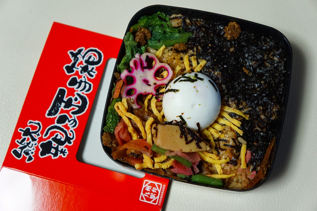 JR九州の駅弁キャンペーン「第12回九州駅弁グランプリ」へのエントリーに合わせ、2016(平成28)年10月に熊本駅と新八代駅で発売か。以下のとおり過去に3回以上買ったことがあるような色と形とキャラクターの容器だが、今回は調製元が異なる。中身は鶏飯を刻み海苔と錦糸卵と鶏肉の刻みのストライプで覆い、タマゴと菜の花と大根桜漬などを添える、つまりかしわめし。味もだいたい、九州駅弁のかしわめし。この中身で1,500円もする、値段の高さに驚いた。