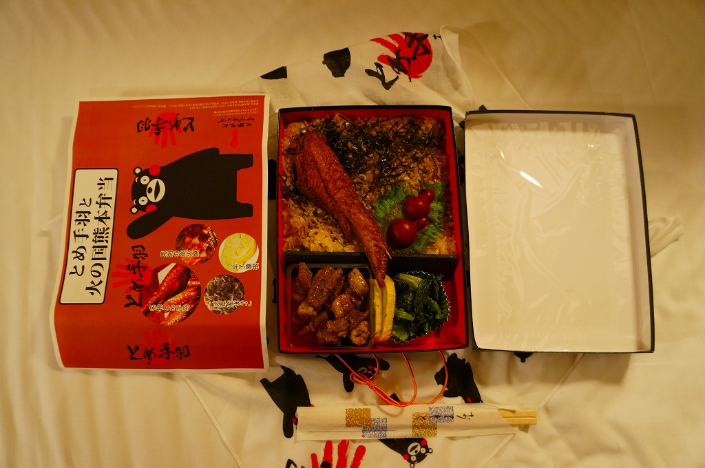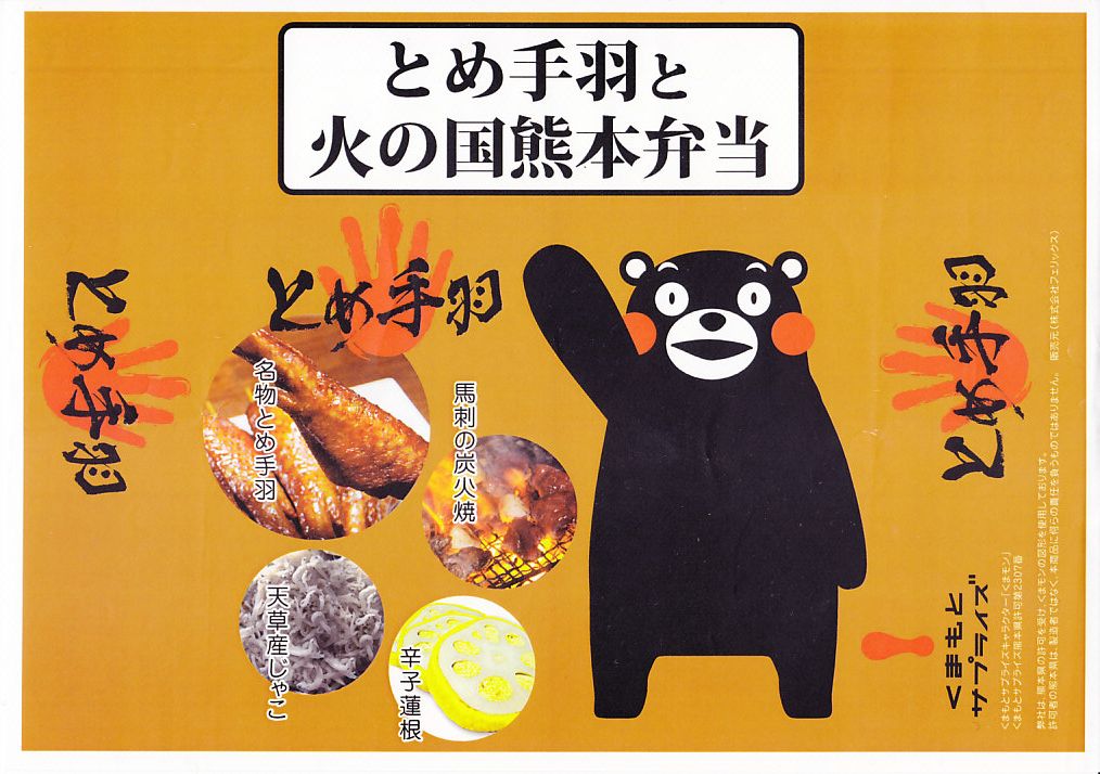 2012(平成24)年2月1〜14日に熊本県熊本市の鶴屋百貨店で開催された「第49回全国有名駅弁当とうまいもの大会」で、熊本駅の駅弁として先行実演販売されたお弁当。真っ黒なボール紙製容器に、熊本県のキャラクター「くまモン」や中身のイメージ写真を印刷した掛紙をかけ、くまモンの風呂敷で包む。中身は茶飯の上に刻み海苔を振り、串で棒状に伸ばした鶏手羽肉「とめ手羽」をひとつ置き、馬肉炭火焼、からしれんこん、高菜漬などを添えるもの。