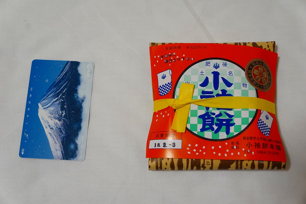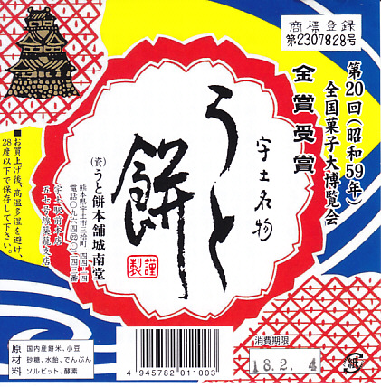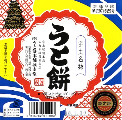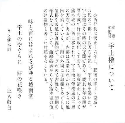2006(平成18)年1月29日に購入した、うと餅の掛紙。こういう地元の銘菓の掛紙や包装紙は、長年変わらないものと思い込んでいたし、見た目は同じなのだが、12年後のものと比べて、書いてあることがかなり異なるのに驚いた。「うと餅」の文字から異なり、裏面の宇土櫓の解説文にも差異がある。