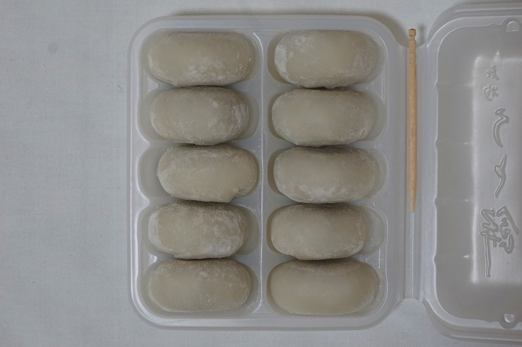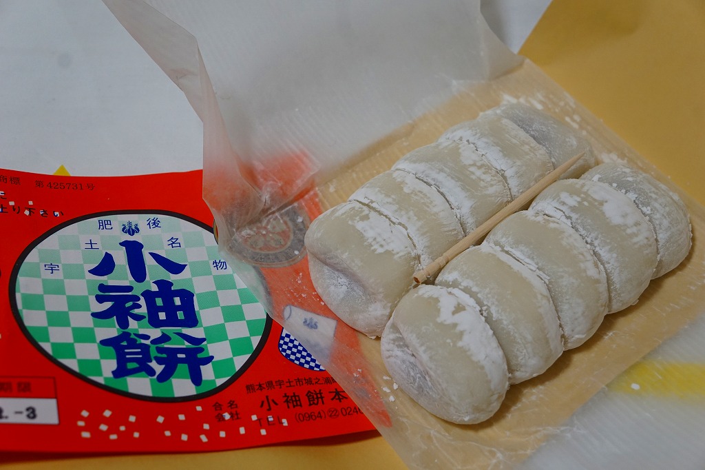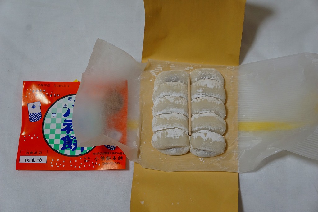 宇土駅で長らく駅売り名物だったはずの鉄道銘菓。2009(平成21)年の駅舎の建て替えで駅に売店がなくなり、その前に62年の歴史を刻んだ和洋折衷の木造駅舎にあった売店は閉店していたようだが、この商品は今も駅前のコンビニで買える。白く小さな専用プラ容器に、昔風の掛紙をかけて紙帯でしばり、専用の紙袋に入れて渡される。中身は10個の小さなこしあん入り餅。心地よい甘さと柔らかさ、そして日を置くと硬くなる点が昔懐かしい、今でいう駅スイーツや空スイーツの原点。価格は2006年時点で263円、2016年時点で324円。