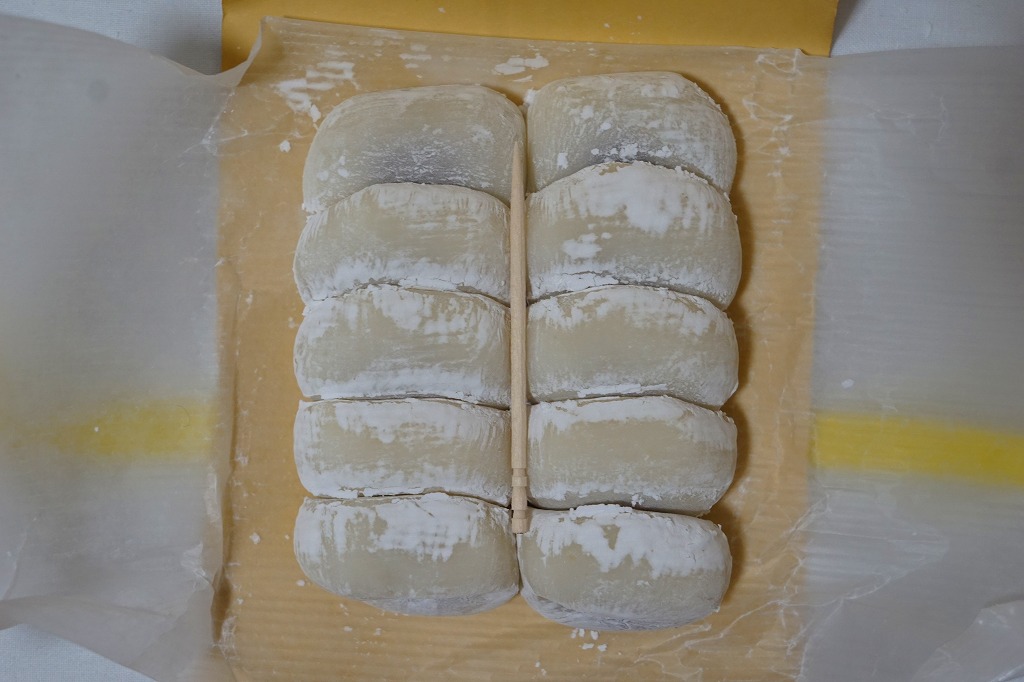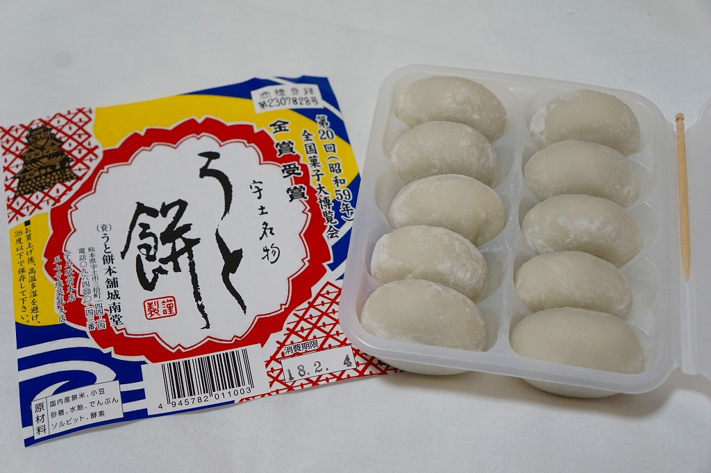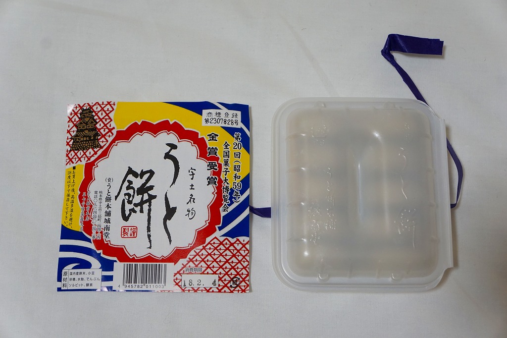 宇土駅で長らく駅売り名物だったはずの鉄道銘菓。2009(平成21)年の駅舎の建て替えで駅に売店がなくなり、その前に62年の歴史を刻んだ和洋折衷の木造駅舎にあった売店は閉店していたようだが、この商品は今も駅前の調製元で売られるほか、熊本市内でも買える場所がある。10個の白く小さなあんころもちを、半透明の紙に包み、竹皮の柄を印刷した紙でまた包み、古めかしいデザインである朱色の掛紙をかけて、黄色い紙ひもでしばっていた。下の「うと餅」との違いは、調製元だけではないかと思う。昭和の昔の宇土駅でどうやって共存していたかは、今となってはもう分からない。