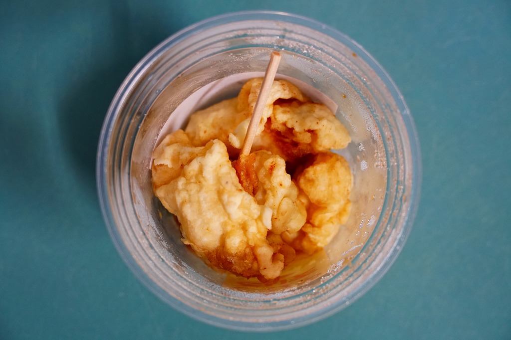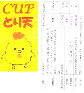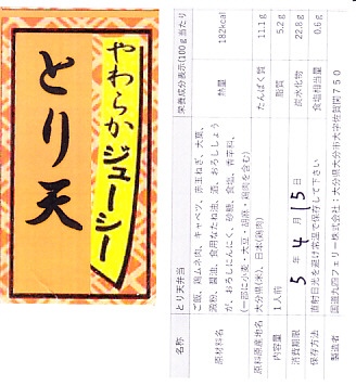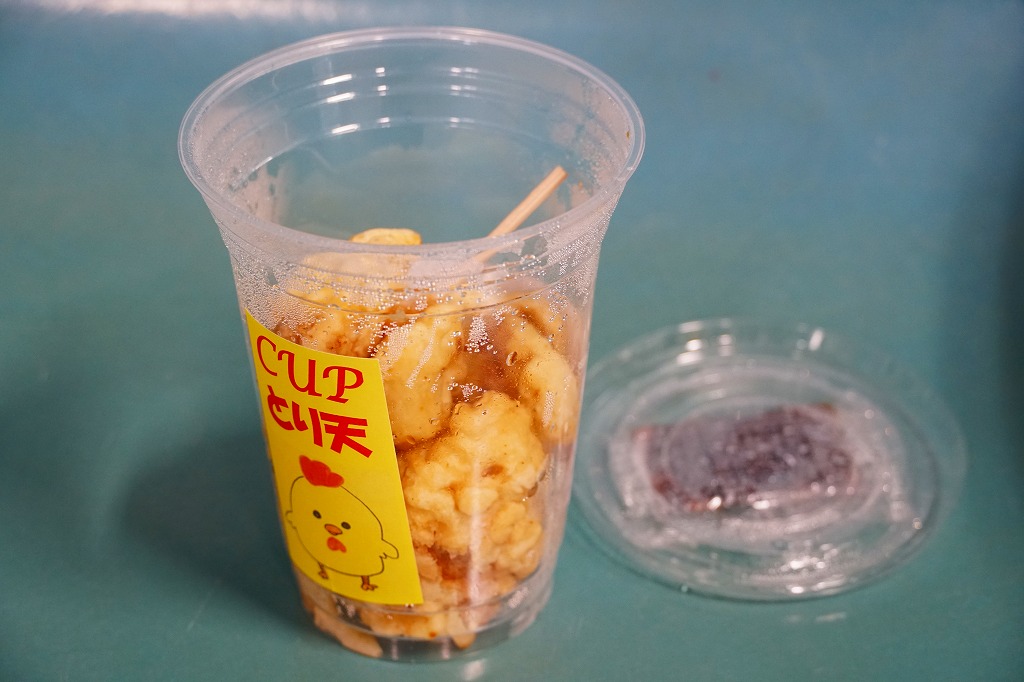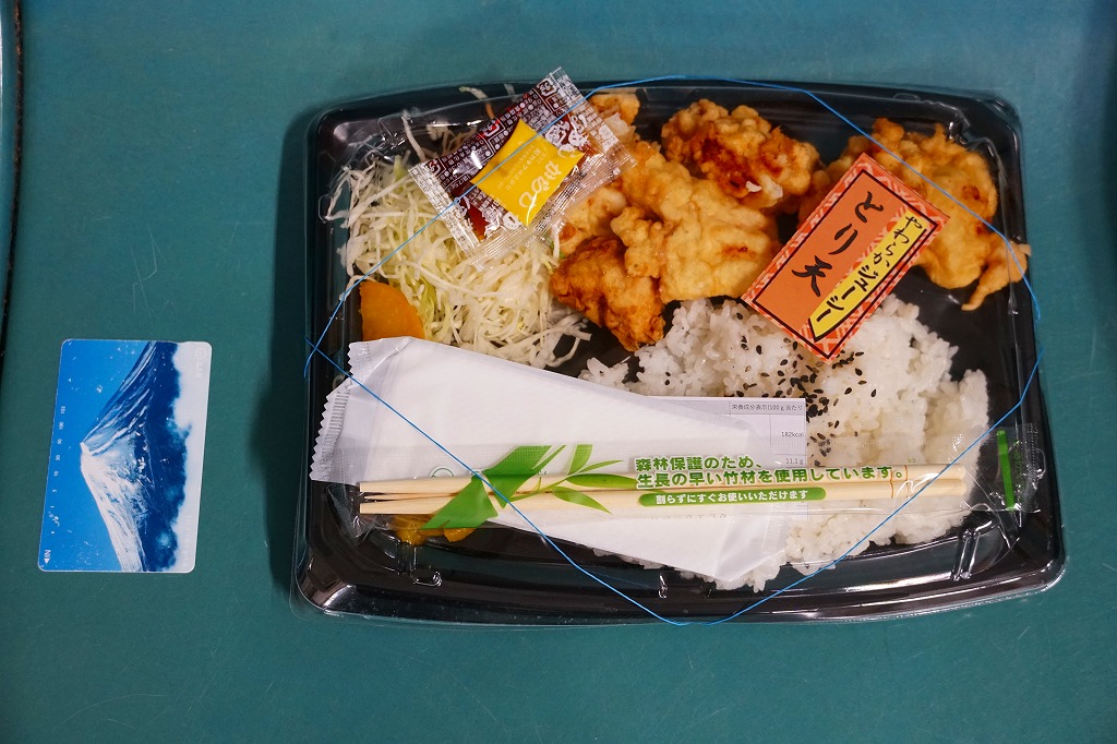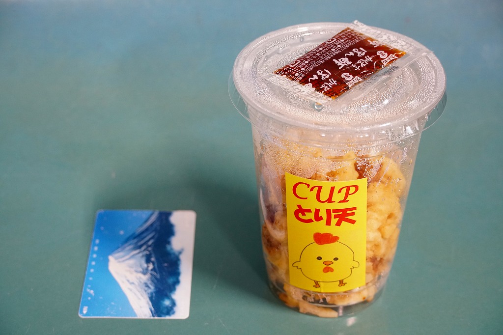 これは駅弁でなく、港で買えたお惣菜。愛媛県の三崎と大分県の佐賀関を結ぶ国道九四フェリーの、佐賀関港フェリーターミナルの土産物店で買えた。鶏肉の天ぷら、大分名物のとり天が、飲料向けのプラ製カップに、収まるだけ詰められる。このような惣菜は大分ではありふれていて、過去に別府駅でも買えたことがある。これも調製元はフェリー会社。