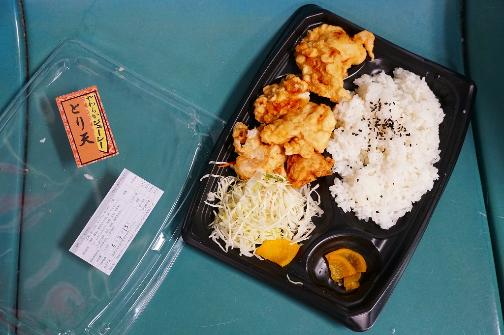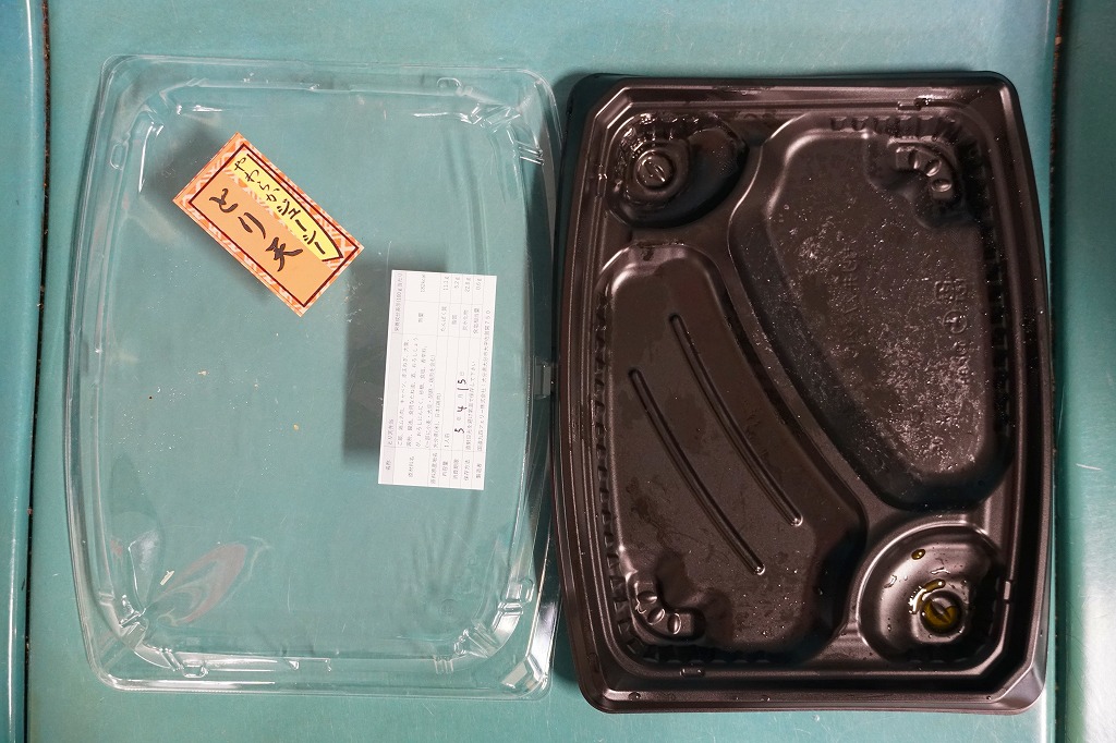 これは駅弁でなく、港で買えたお弁当。愛媛県の三崎と大分県の佐賀関を結ぶ国道九四フェリーの、佐賀関港フェリーターミナルの土産物店で買えた。港の弁当とは名乗っていない。黒いプラ製トレーに、白飯ととり天と千切りキャベツと沢庵を盛り付ける、まるでスーパーの惣菜弁当。この鶏肉の天ぷらは大分の郷土料理であるから、大分の港の弁当として、旅行者が買って感心する弁当にふさわしい。この大分県の佐賀関港で売られるほか、フェリーに乗って愛媛県の三崎港の切符売り場でも販売される。調製元はフェリー会社そのもの。