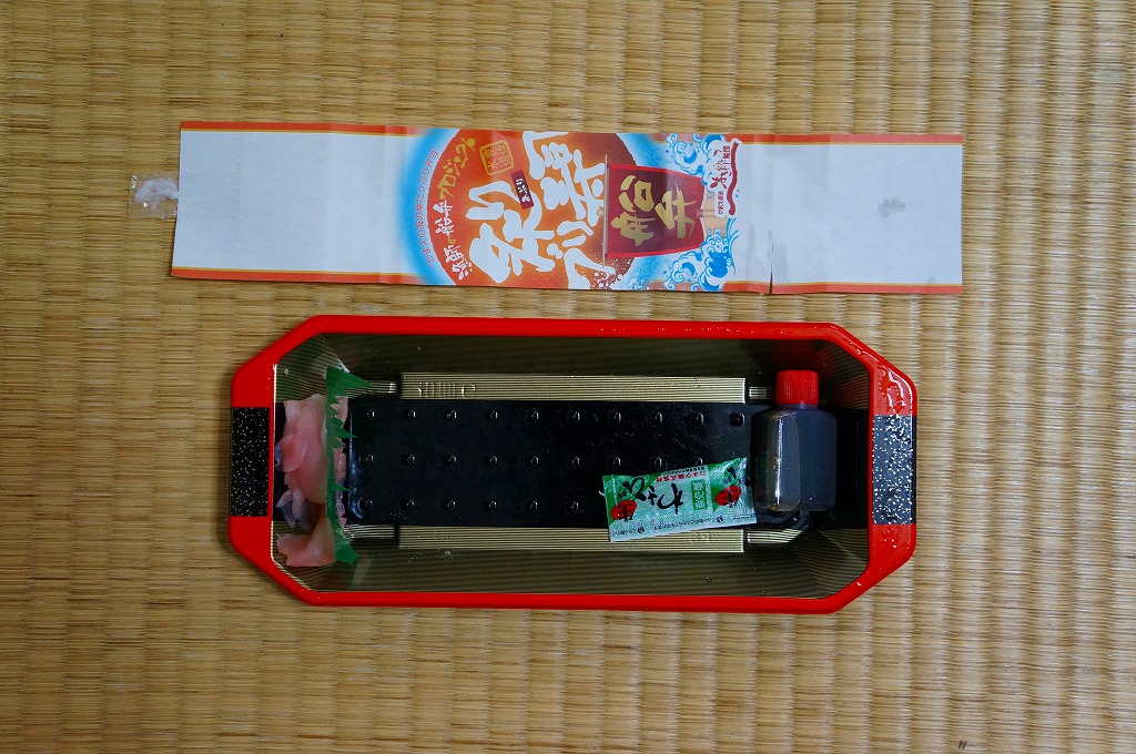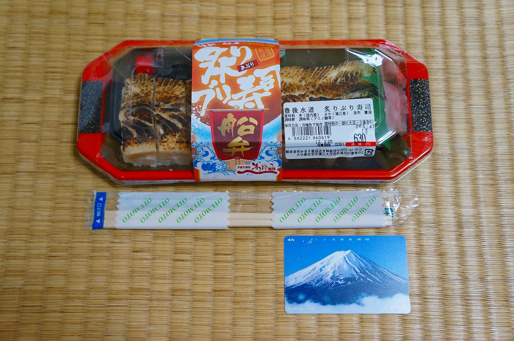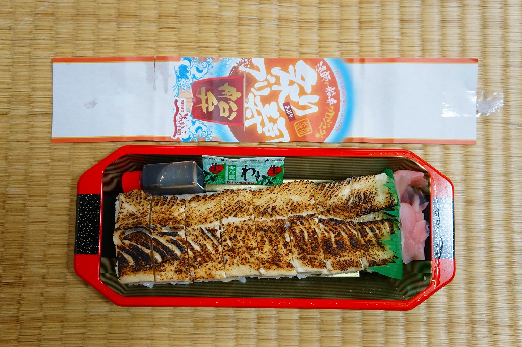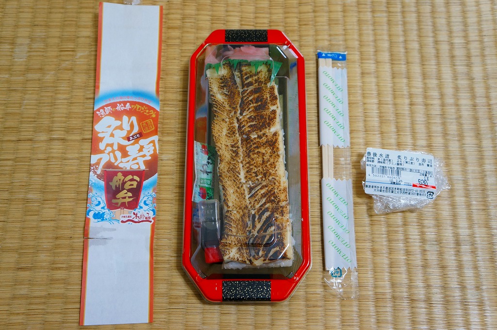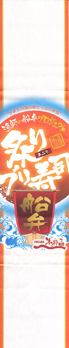 これは鉄道の駅弁でなく、国道388号沿いの「道の駅かまえ」で販売されていたお総菜。駅弁、空弁、速弁に次ぐ「船弁」として開発したといい、商品名を描いた紙帯に船弁と2回書く。中身は四角い棒状の酢飯に、地元の養殖ブリの薄切りを炙ったものを貼り合わせたもの。煮たり生で食べることが多い魚の、また違った香りと食感を楽しめた。