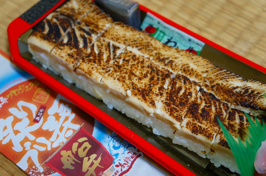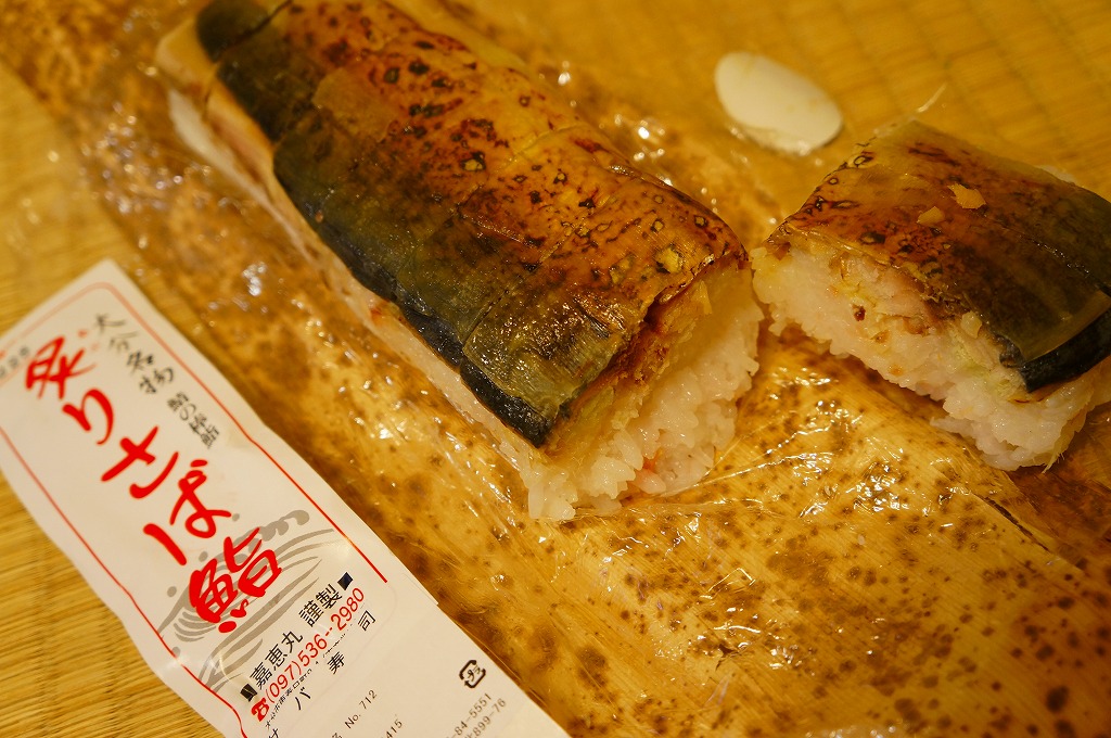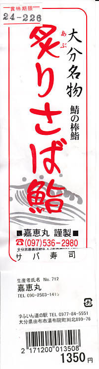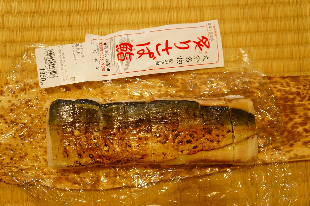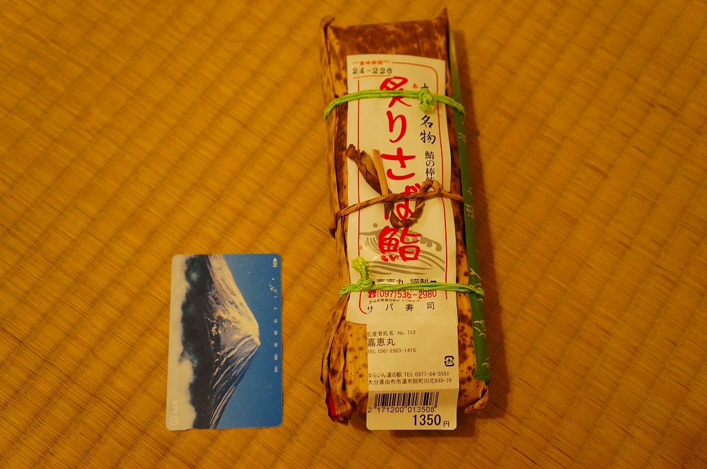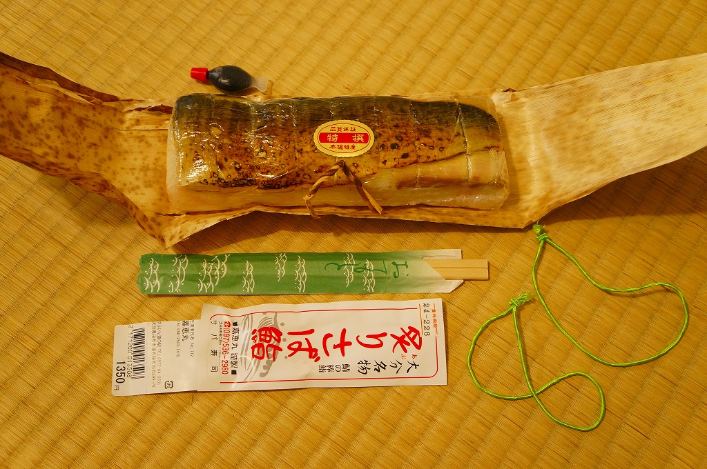 これは鉄道の駅弁でなく、大分自動車道湯布院インターチェンジの出口真正面にある「道の駅ゆふいん」で買えた、道の駅弁のようなもの。酢飯とサバを貼り合わせて8切れにカットした焼きサバ寿司が、ラップと竹皮に包まれる。小柄なのに、なかなかの値段。価格の札に切れ目を入れたことから、道中の弁当というよりはむしろ、土産物として売るのだろう。