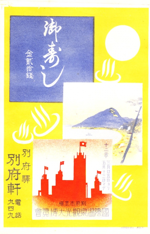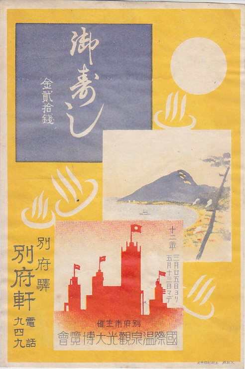 記載事項から1937(昭和12)年の調製と思われる、昔の別府駅弁の掛紙。別府湾と高崎山の風景に、1937年3月から5月まで別府公園で開催された国際温泉観光大博覧会のシルエットを描いた。