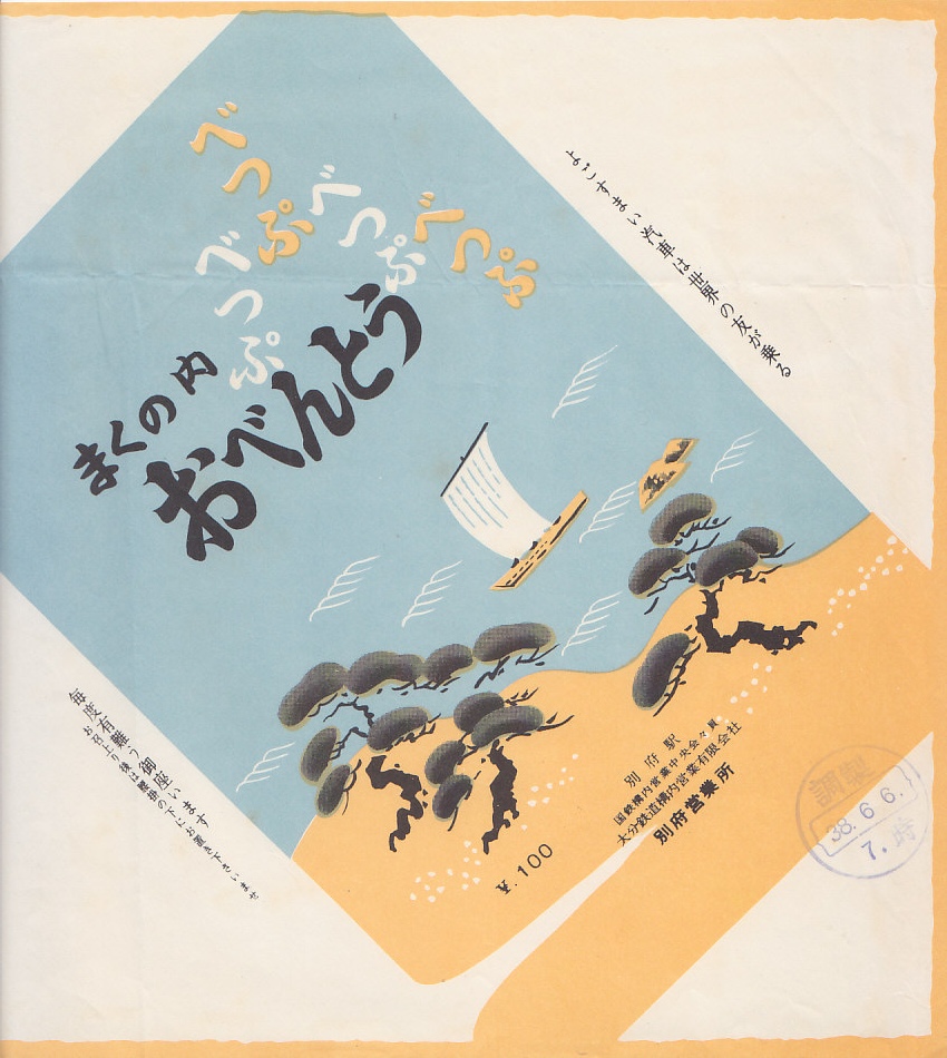 1963(昭和38)年6月6日(木)7時の調製と思われる、昔の別府駅弁の掛紙。絵柄は下記のものと同じ。べっぷを4度もひらがなで繰り返す、不思議な絵柄。
