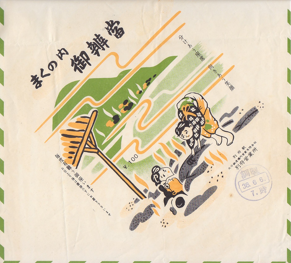 1963(昭和38)年6月6日(木)7時の調製と思われる、昔の別府駅弁の掛紙。海に面したこのような露天風呂は、当時の別府海岸にあったのだろうか。同じ年月日時に調製した同じ名前と値段の駅弁で、掛紙が2種類出てきたのは不思議。