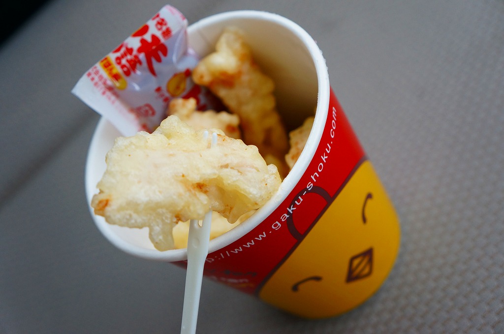 大分限定の名物「とり天」の、駅で買えたパッケージ。小鳥かニワトリを描いた赤い紙製カップの中に、鶏肉に小麦粉ベースと思われる衣を厚めに付けた小柄な天ぷらがゴロゴロと詰まり、ポン酢の袋が添えられる。味は見た目に違いかなりあっさりしており、とてもお手軽なファストフード。