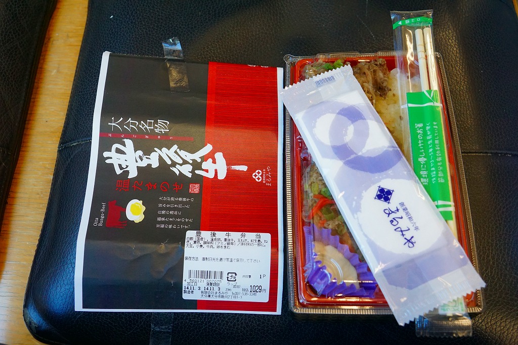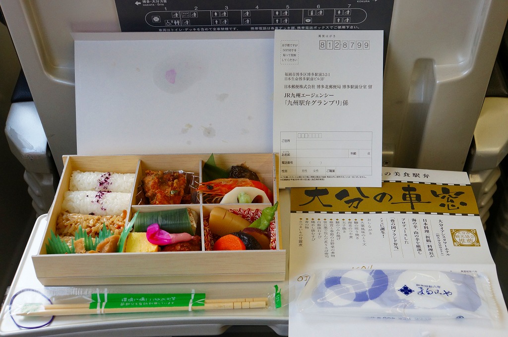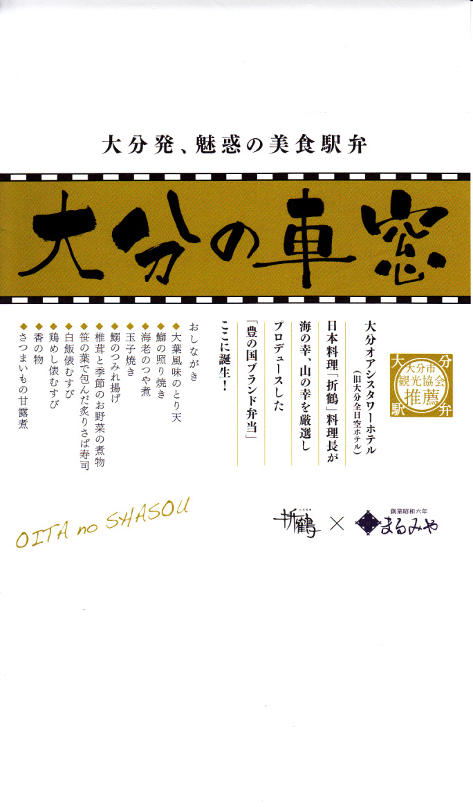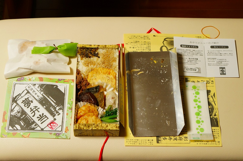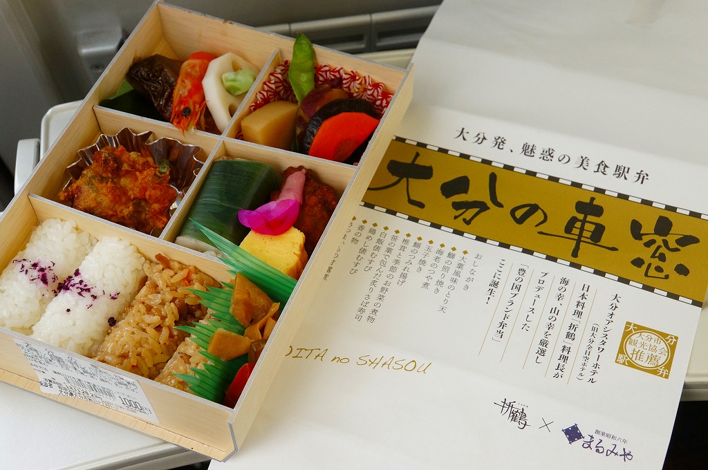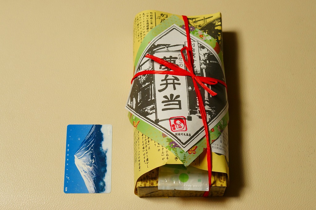 中身と大分や車窓が結びつかないと思うが、いろんなおかずが楽しめる美しいお弁当。ネット上の宣伝文によると、鶏飯とシイタケと漬物とブリなどが大分で、弁当箱の枠が車窓なのだそうな。調製元は大分市内の仕出し弁当屋。価格は2013年の購入時で1,000円、2014年4月の消費税率改定で1,029円。2016年頃までの販売か。