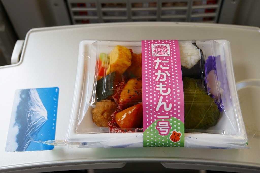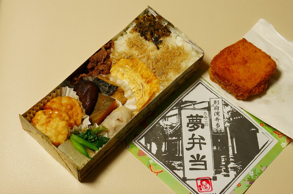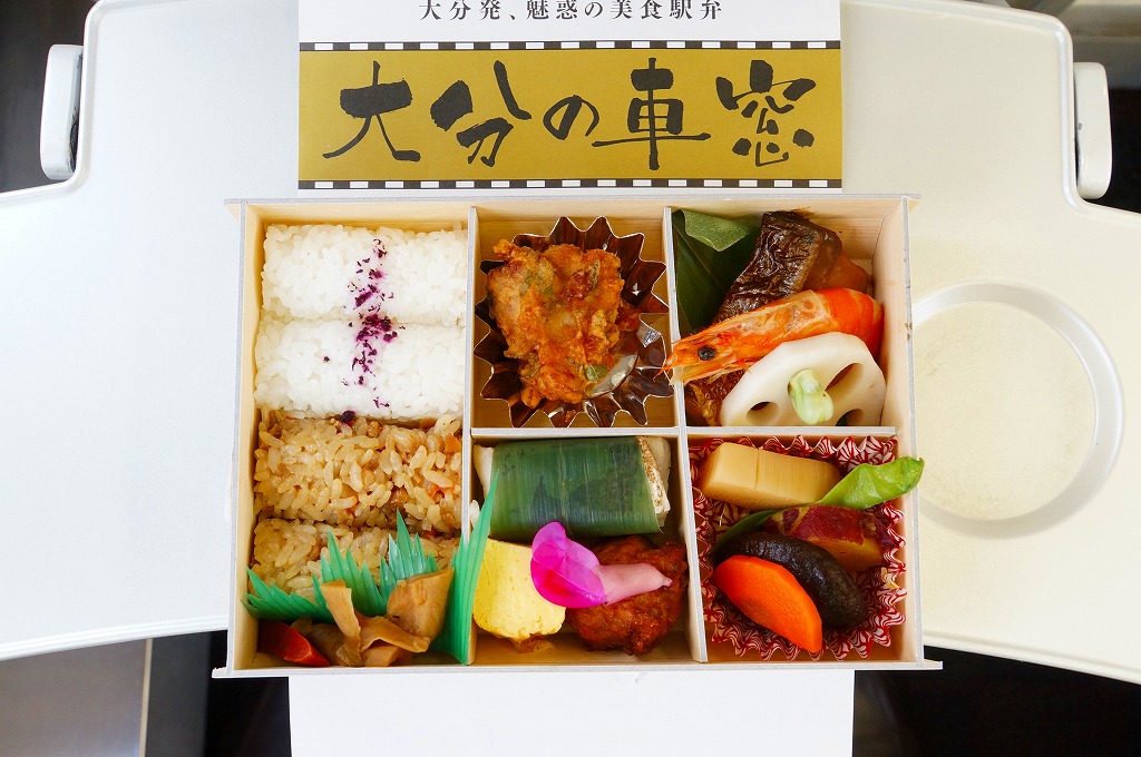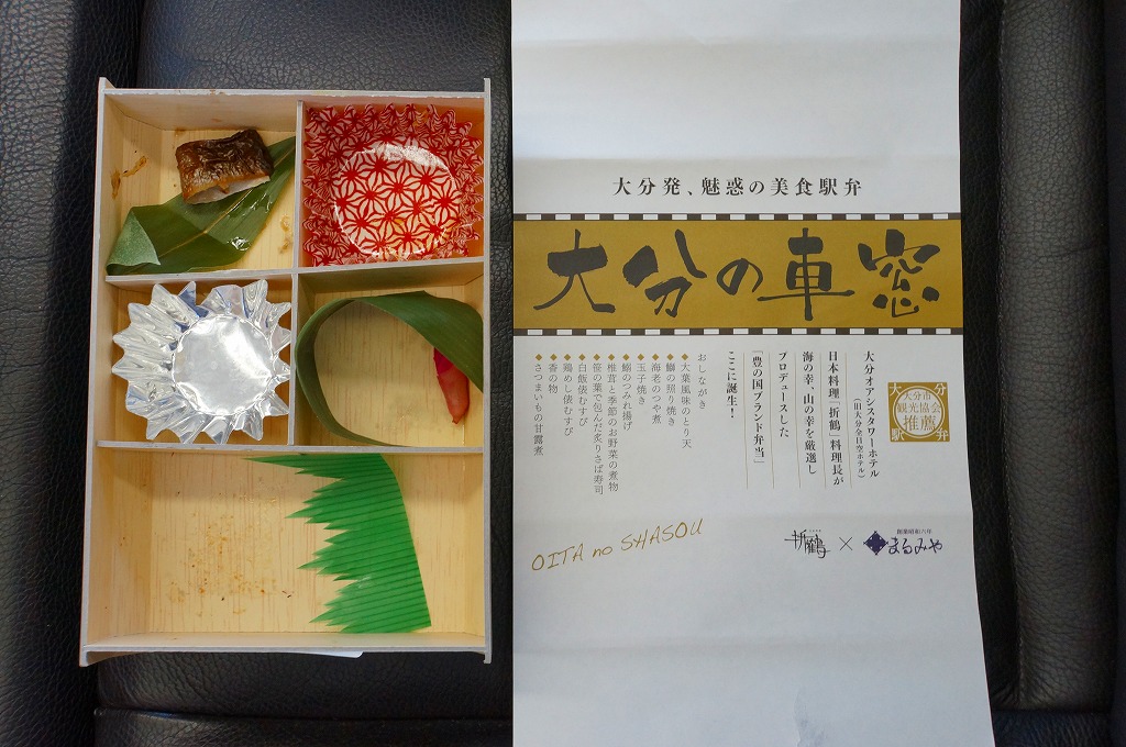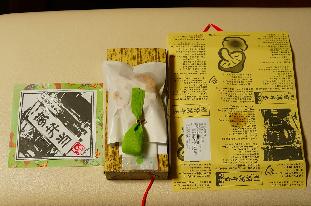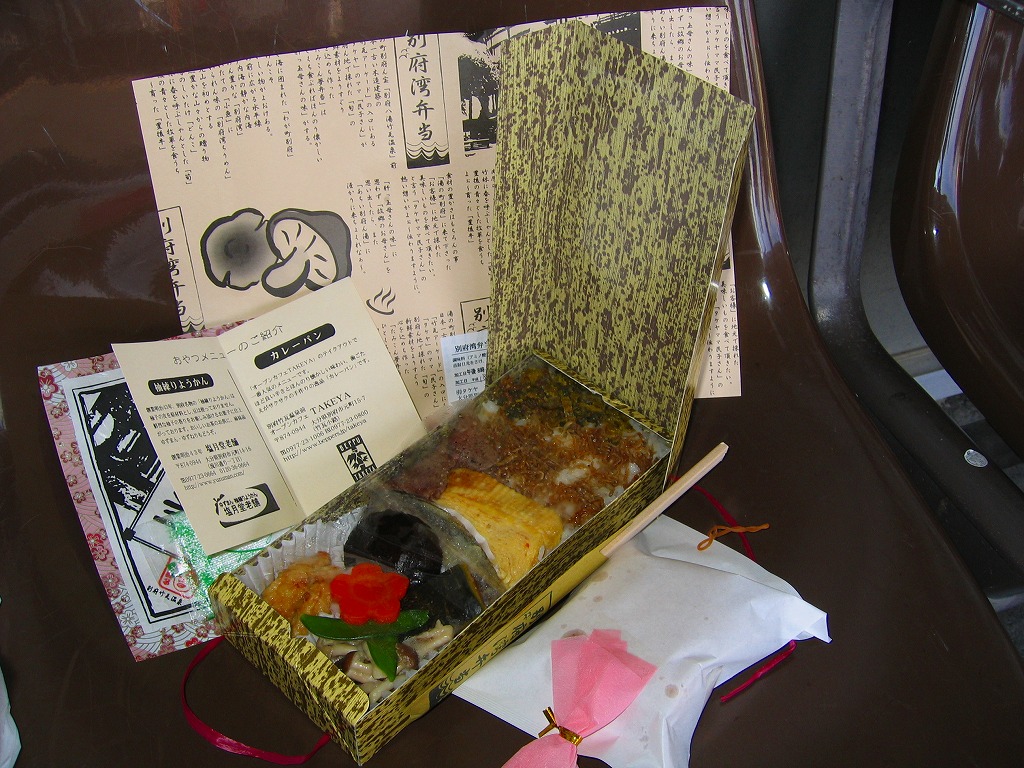 中身と大分や車窓が結びつかないと思うが、いろんなおかずが楽しめる美しいお弁当。ネット上の宣伝文によると、鶏飯とシイタケと漬物とブリなどが大分で、弁当箱の枠が車窓なのだそうな。調製元は大分市内の仕出し弁当屋。価格は2013年の購入時で1,000円、2014年4月の消費税率改定で1,029円。2016年頃までの販売か。