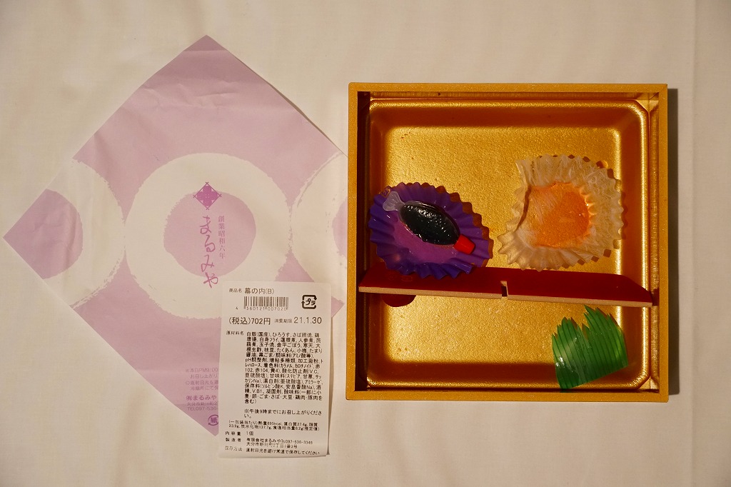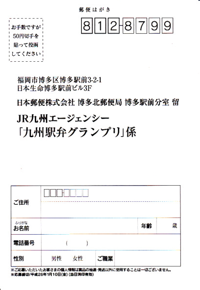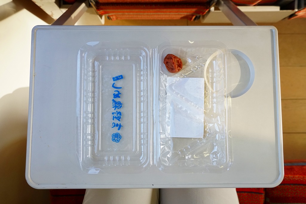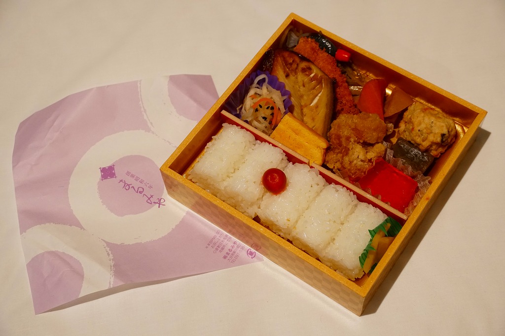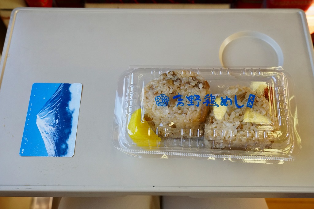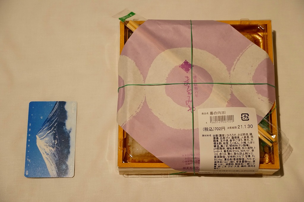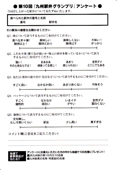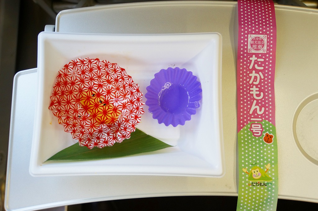 中身と大分や車窓が結びつかないと思うが、いろんなおかずが楽しめる美しいお弁当。ネット上の宣伝文によると、鶏飯とシイタケと漬物とブリなどが大分で、弁当箱の枠が車窓なのだそうな。調製元は大分市内の仕出し弁当屋。価格は2013年の購入時で1,000円、2014年4月の消費税率改定で1,029円。2016年頃までの販売か。