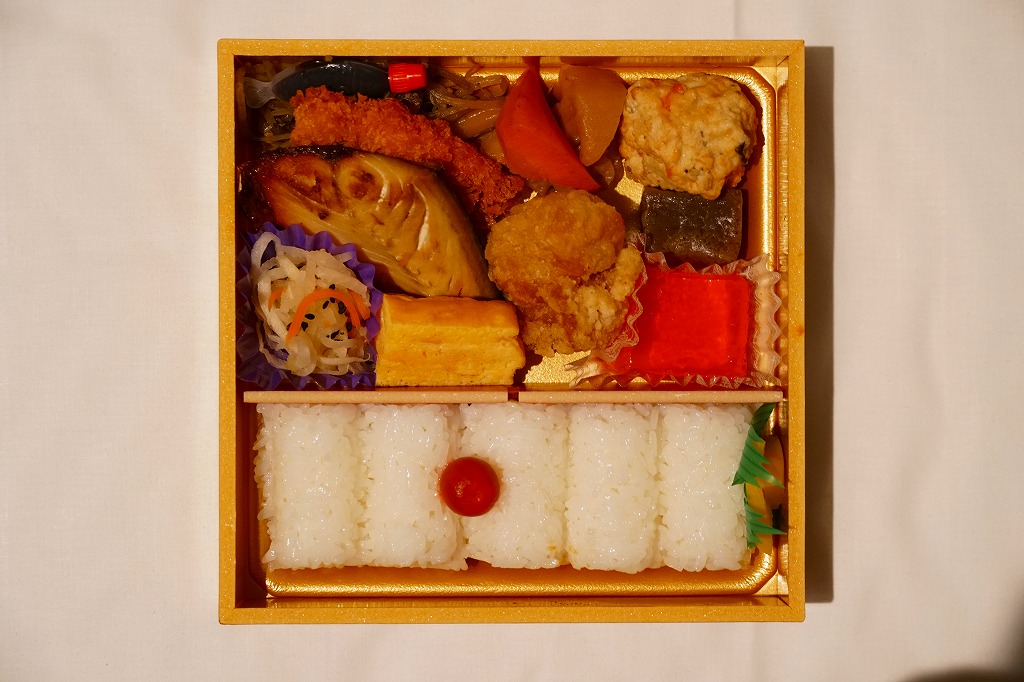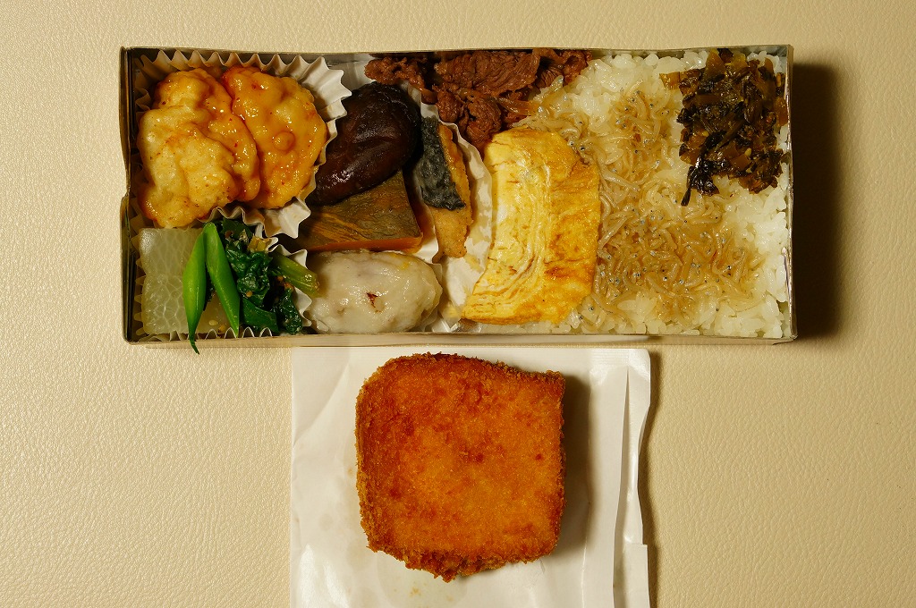 俵型の型押し飯に梅干しとたくあんを添え、サバ照焼、鶏唐揚、白身魚フライ、玉子焼、ごぼうやれんこんなどの煮物、酢の物、寒天。コンパクトで機能的な、機能的でしかない幕の内弁当。商品名に「(B)」とあるが、売店にこれ以外の幕の内弁当は現物も掲示もなかった。