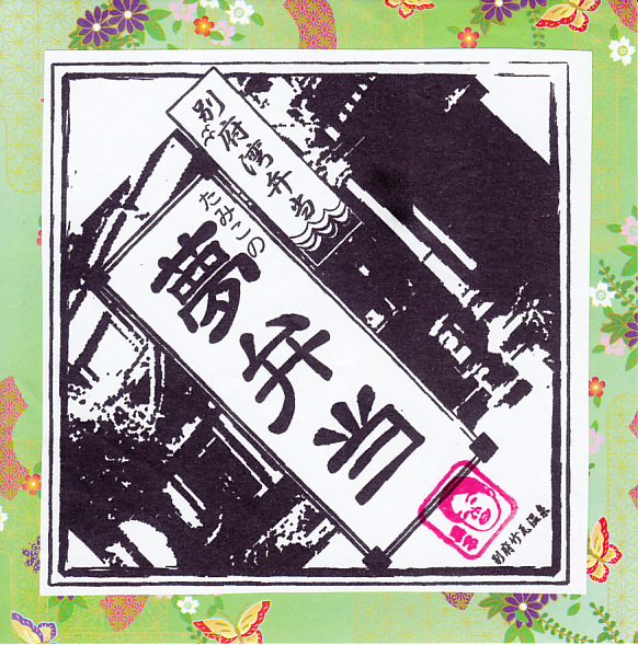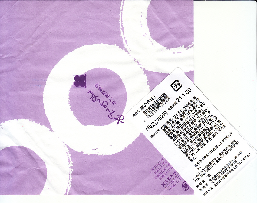 2006(平成18)年1月28日に購入した、別府の駅弁の掛紙。掛紙の背景としての和紙の絵柄のみが異なり、容器も中身も味も名前も同じ。