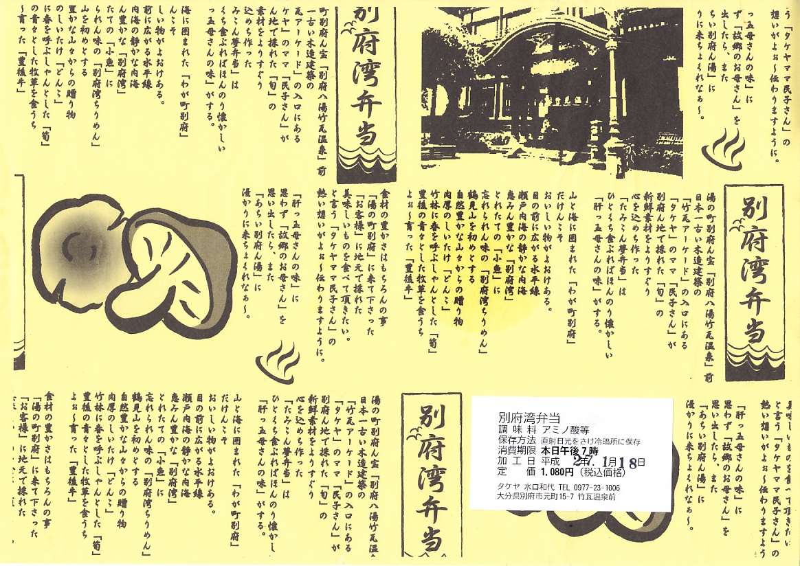 小言やウンチクを語ろうとする口を黙らせる美味さと雰囲気の良さは、別府の活性化を担える実力を持つ。しかし2005年の発売時、これを買うには購入の2日前までにJR九州の駅の窓口で予約券を買い、別府駅から少し歩く調製元で引き替える必要があった。駅で売らない弁当が駅弁を名乗ることに違和感を覚えたし、全50種の駅弁を買い集める駅弁ラリーへの九州外からの挑戦者には高いハードルとして立ちはだかった。後に少なくとも別府駅では、売店で普通に買える駅弁になった模様。