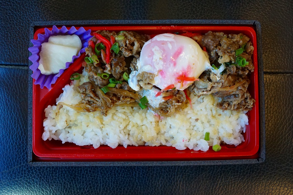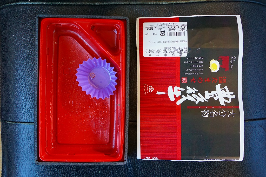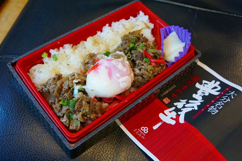 この調製元の弁当が大分駅に置かれ始めた2012(平成24)年前後の発売か。不思議と白飯の半分だけ牛焼肉で覆い、温泉卵を載せ、漬物を添えた牛丼弁当。肉が豊後牛で、ネギやタマネギが適度に混じり、駅弁の名物にはならなかったが、おいしい牛肉弁当だった。収穫報告がまったく聞かれないため、現存を含め詳細は不詳。2016年頃までには駅から撤退したのではないかと思う。