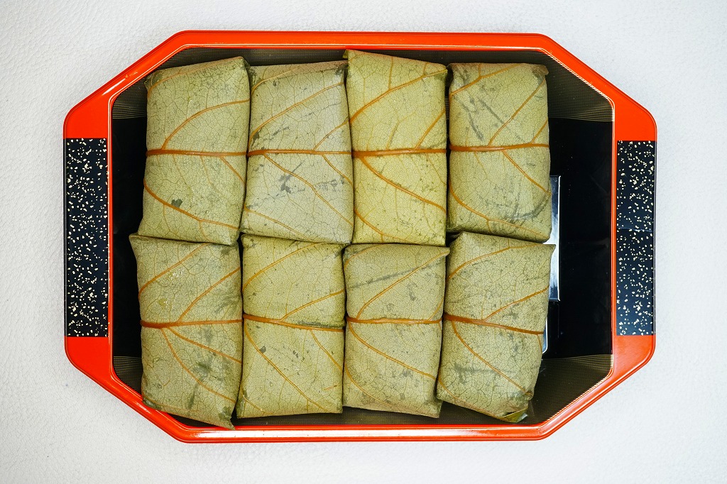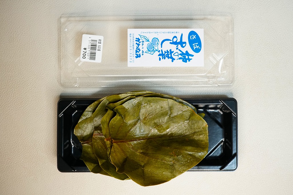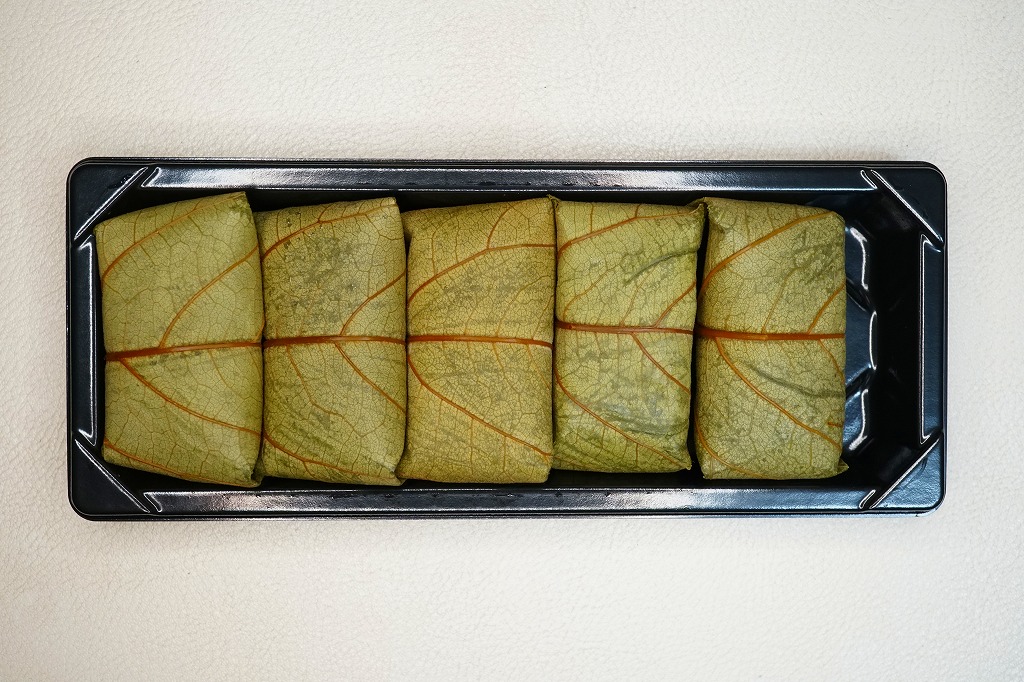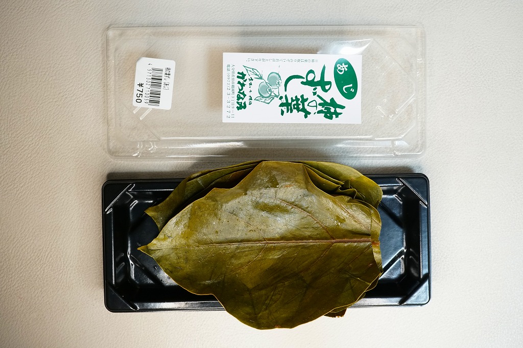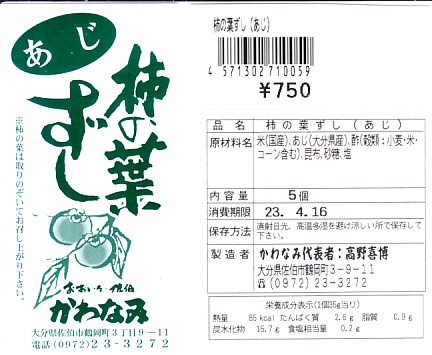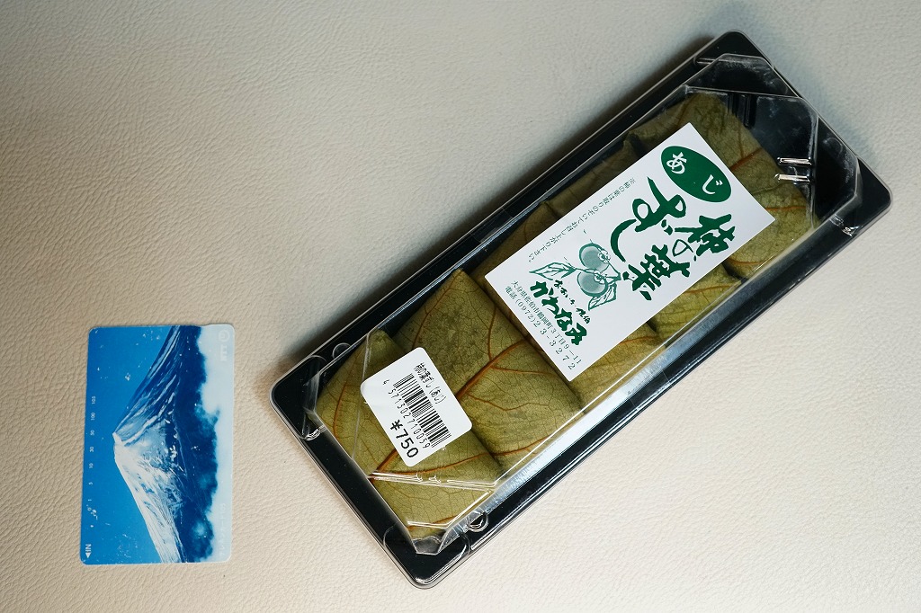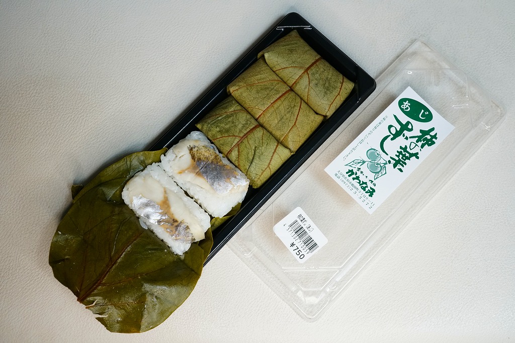 大分駅と別府駅の駅弁売り場で買える柿の葉寿司。惣菜向けプラ容器に、酢飯にアジの切り身を貼り柿の葉で巻いたものを5個並べ、商品名と価格と食品表示のシールを貼る。全国で売られても奈良や吉野やその周辺の名物や郷土料理とされる柿の葉寿司と同じものが、大分と宮崎の県境でも、あるいは大分県佐伯市でも名物を名乗り、またはこの調製元「かわなみ」の柿の葉ずしが人気となり、大分の鉄道駅や空港や道の駅などでも売られる。崩れや酸味のない、身が小さくても締まりと新鮮さを感じる、おいしいアジの柿の葉寿司。