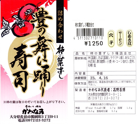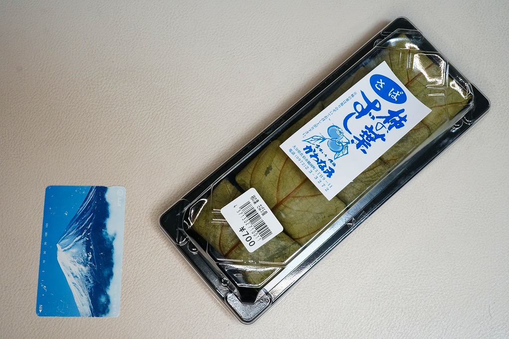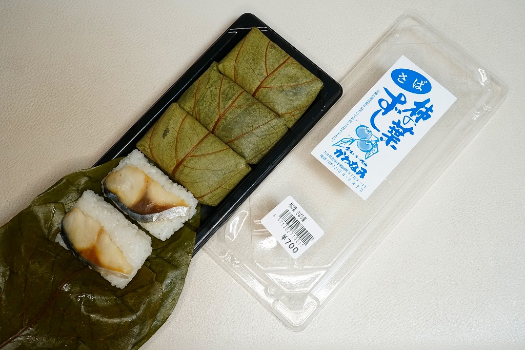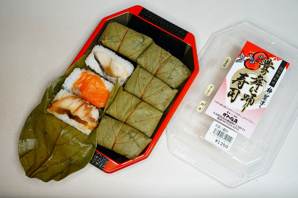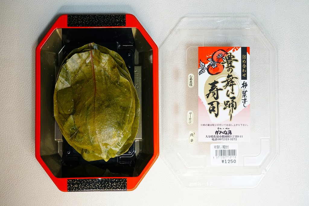 大分駅と別府駅の駅弁売り場で買える柿の葉寿司。惣菜向けプラ容器に、酢飯にサバの切り身を貼り柿の葉で巻いたものを5個並べ、商品名と価格と食品表示のシールを貼る。全国で売られても奈良や吉野やその周辺の名物や郷土料理とされる柿の葉寿司と同じものが、大分と宮崎の県境でも、あるいは大分県佐伯市でも名物を名乗り、またはこの調製元「かわなみ」の柿の葉ずしが人気となり、大分の鉄道駅や空港や道の駅などでも売られる。普通においしいサバの柿の葉寿司。
