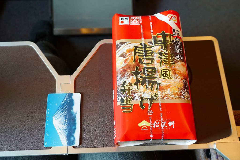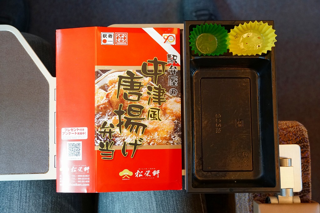 2018(平成30)年の秋に新大阪駅で発売か。鹿児島県の松栄軒の駅弁は、大分駅でも販売されているというから、これは大分駅の駅弁でもあるのだろうか。白御飯を錦糸卵や刻み海苔、駅弁にしては大きめの鶏唐揚や煮玉子で覆い、高菜と柴漬けを添える。唐揚げ弁当は駅弁には多くないが、これは衣が色も厚みも薄く、唐揚げというよりは竜田揚のような軽さを持つ。衣でなく肉に味を付けることが、中津からあげの特徴だという。大分県中津市には不思議と鶏唐揚屋が多かったそうで、21世紀になってからこれを「中津からあげ」と名付け、宣伝されるようになった。この駅弁が大分駅で現存するかは不詳。