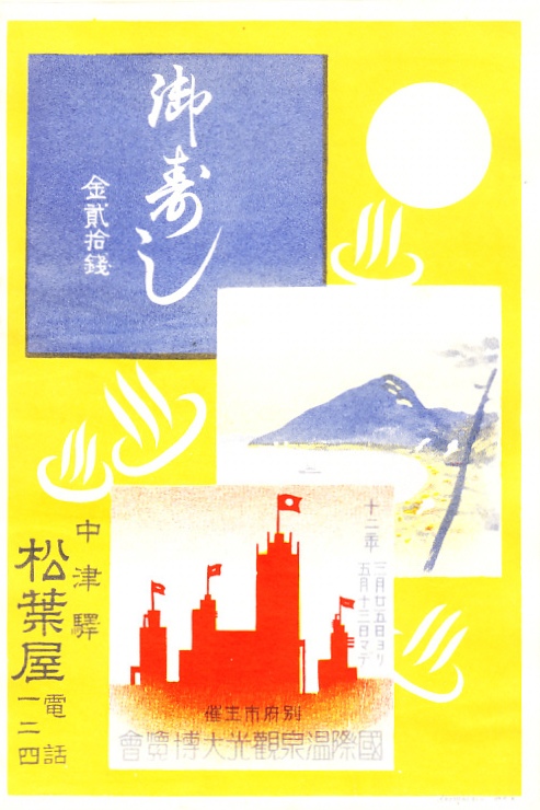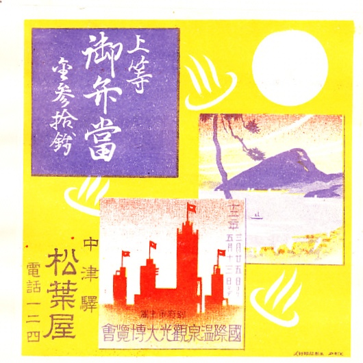 記載事項から1937(昭和12)年のものと思われる、昔の中津駅弁の掛紙。別府湾と高崎山の風景に、1937年3月から5月まで別府公園で開催された国際温泉観光大博覧会のシルエットを描いた。別府駅の駅弁と同じ絵柄を持つ。