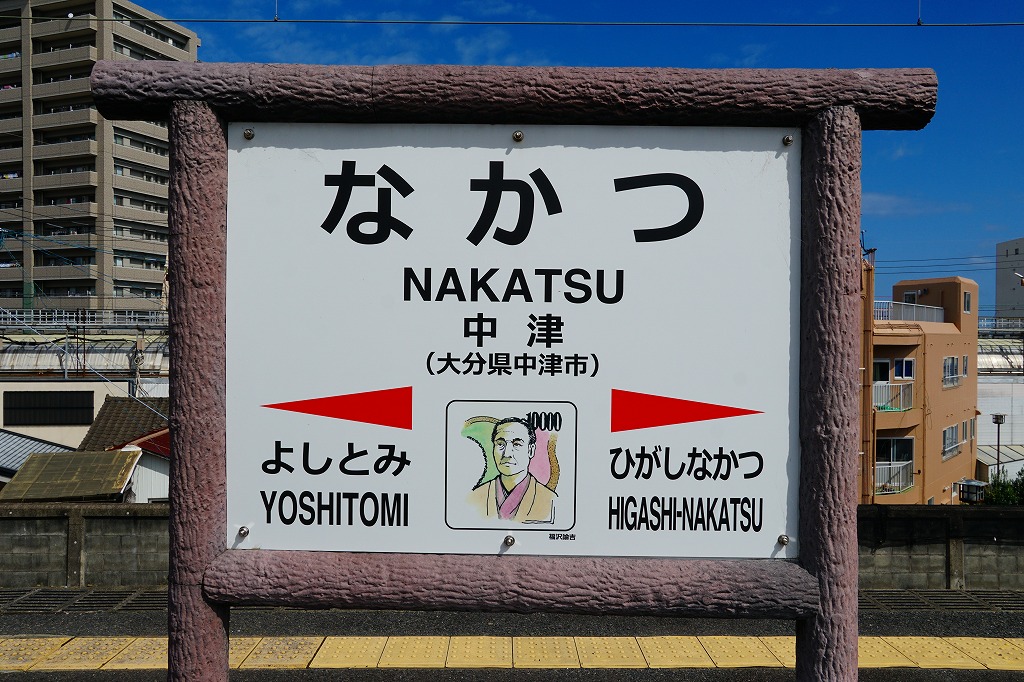 博多から特急列車「ソニック」で約1時間半。中津市は大分県の北西端で周防灘に面した、人口約8万人の城下町。江戸時代に豊前国中津藩の城下町として発展、明治時代に小倉県から福岡県を経て大分県に編入され、繊維工業から製鋼業を経て自動車などの重工業都市になる。福沢諭吉と唐揚げで知られる。駅弁は1920年代で松本政五郎が販売し、1942(昭和17)年には大分駅の駅弁屋が支店を出して販売したが、1998(平成10)年頃に撤退した。1897(明治30)年9月25日開業、大分県中津市大字島田。