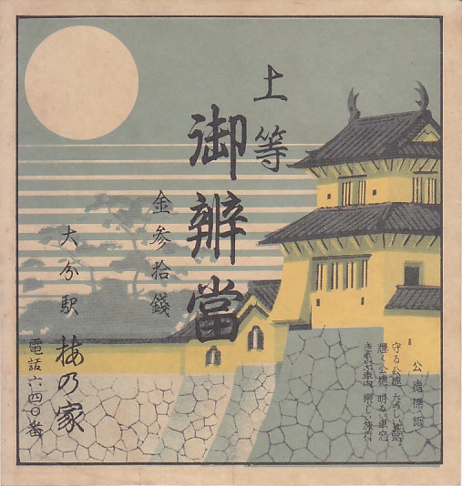 1930年代のものと思われる、昔の大分駅弁の掛紙。大分空襲で焼ける前の、府内城(大分城)の人質櫓とお堀を描いたのだろう。