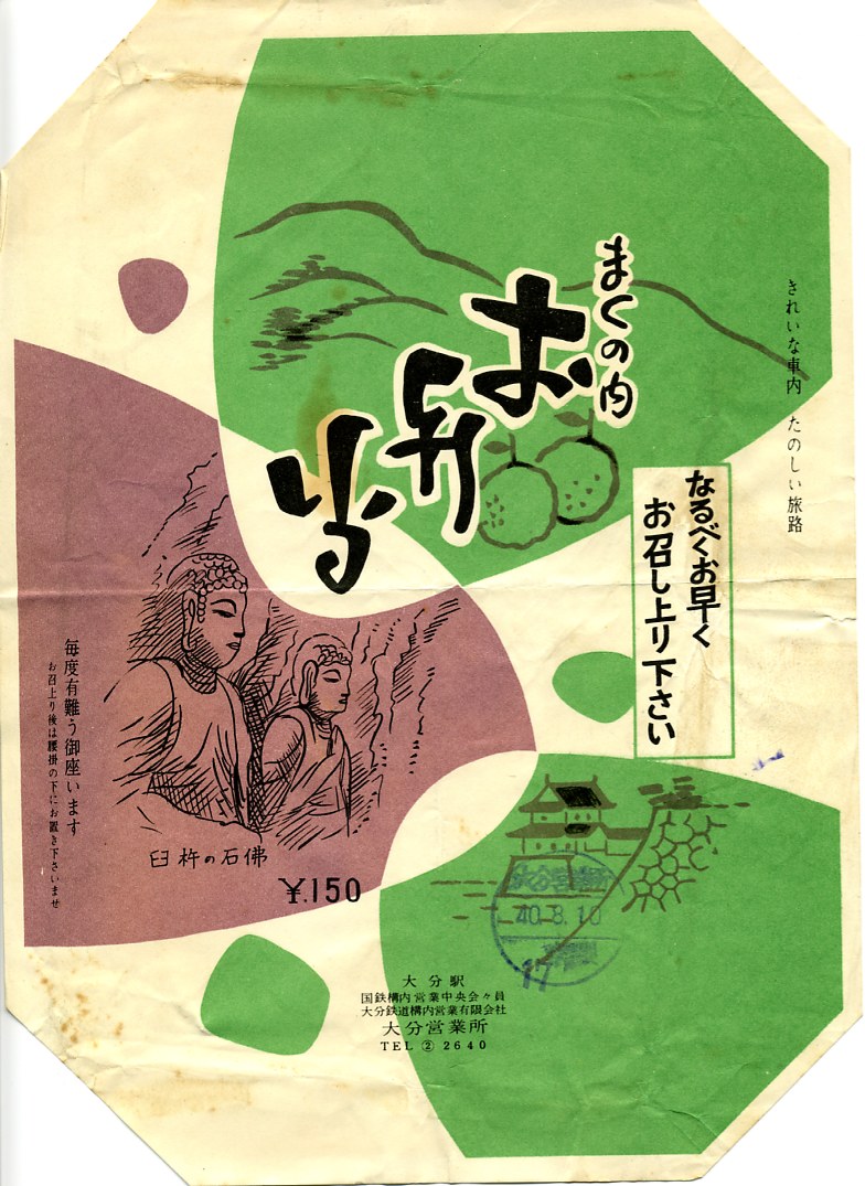 1965(昭和40)年8月10日17時の調製と思われる、昔の大分駅弁の掛紙。描かれるものは上から高崎山、臼杵の石佛、府内城(大分城)だろうか。梅の家の屋号を持つ調製元は、1942(昭和17)年4月に大分県内と延岡駅の駅弁屋が合併してできた会社で、そのため各地の主要駅に営業所を構え、合併後も各駅で異なる駅弁を販売していたが、今はすべて撤退済み。