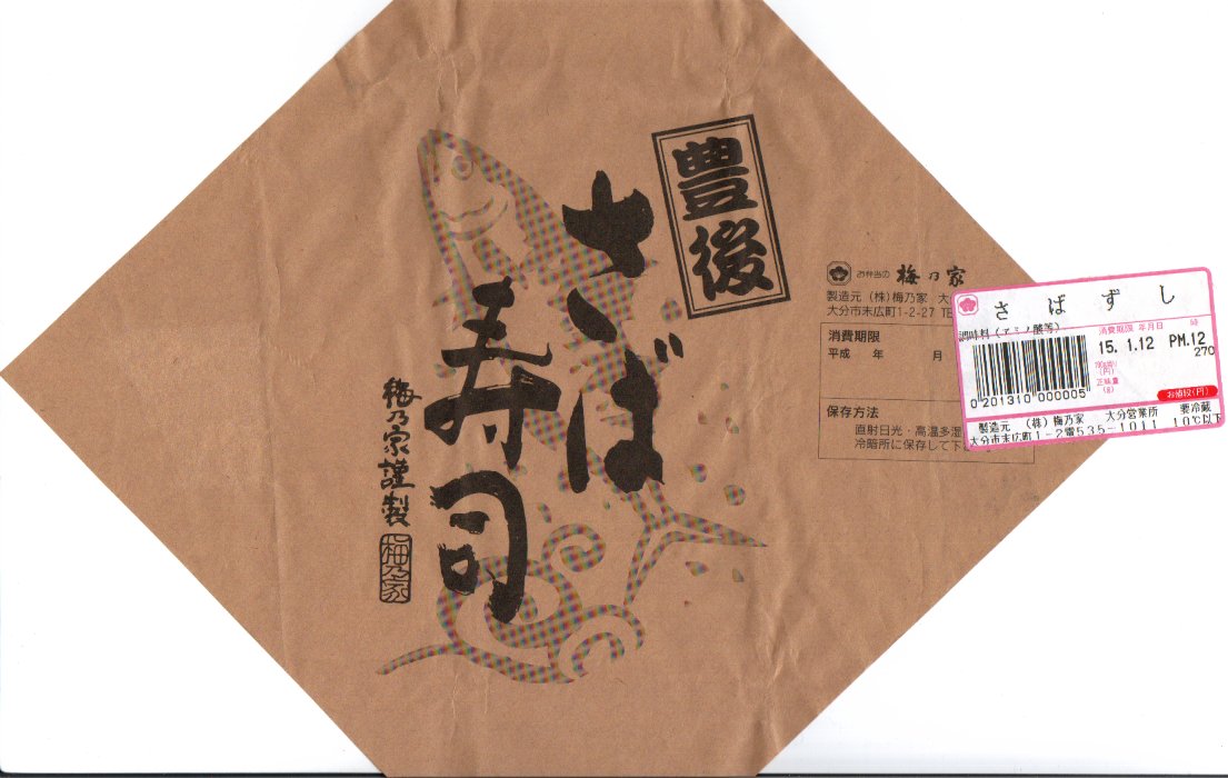 上記の駅弁「豊後さば寿司」と同じもの。しかし「冷蔵庫に入れずに涼しい場所で保存」と、その取り扱いに関する注意点がまるっきり逆になった。見栄えも中身も風味も同じなのに、なんでこんなに違うのかは分からない。