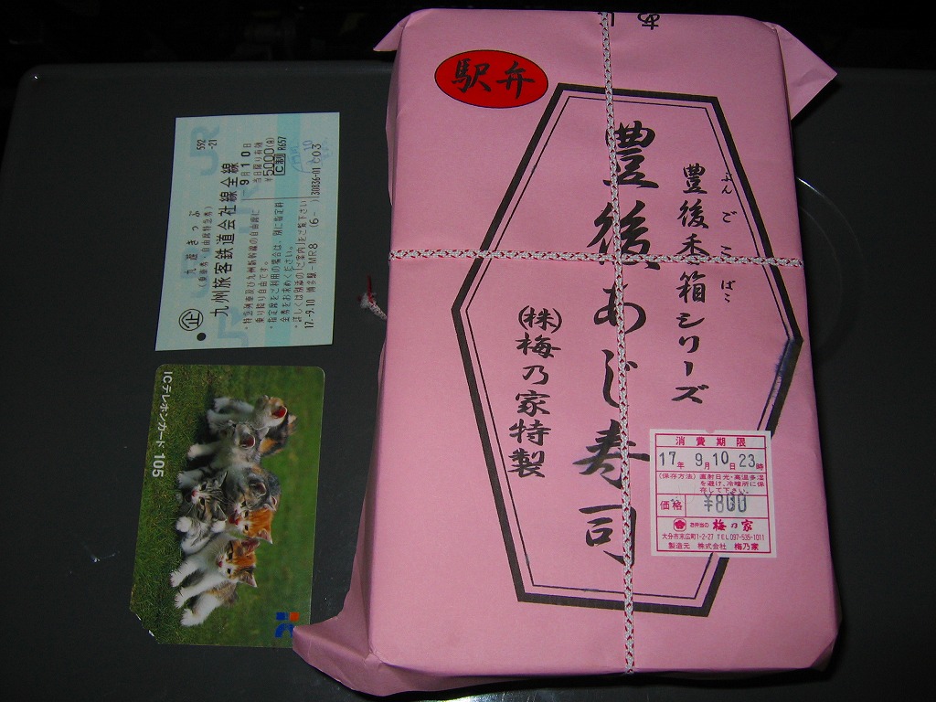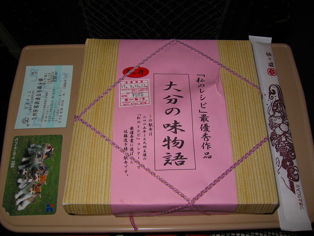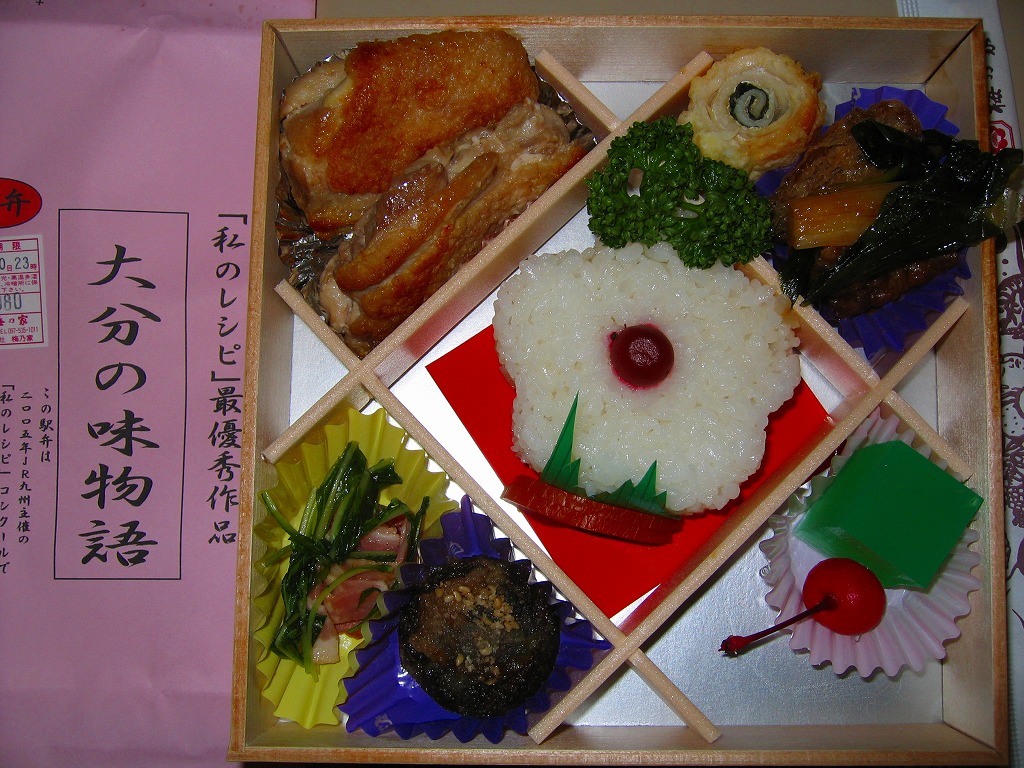 この駅弁は2005(平成17)年「九州の駅弁ランキング第2弾」の駅弁ラリーで全50種の収集を目指すため、その対象の大分駅弁を4種まとめて別府駅受取で予約購入したものだが、売店取り置きではなく調製元係員の直接持参手渡しとなっていて、びっくりした。