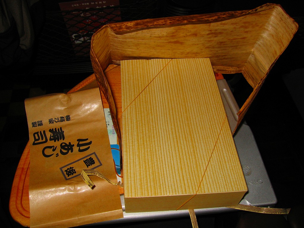 木枠の長方形の容器に木目調の紙ぶたをかけて輪ゴムで留め、さらに竹皮を巻いて商品名を書いた紙をかけて竹皮柄の針金でしばる。中身は大分米ひのひかりの酢飯に大葉を挟んで酢締めの小鯵を載せ、おろし生姜と刻みネギを添える、つまり小鯵寿司。列車内でこういう内容の商品をつまむシチュエーションを想像しにくいのだが、こういう内容で駅弁にしているのは驚いてよいと思うし、味もよいと思う。