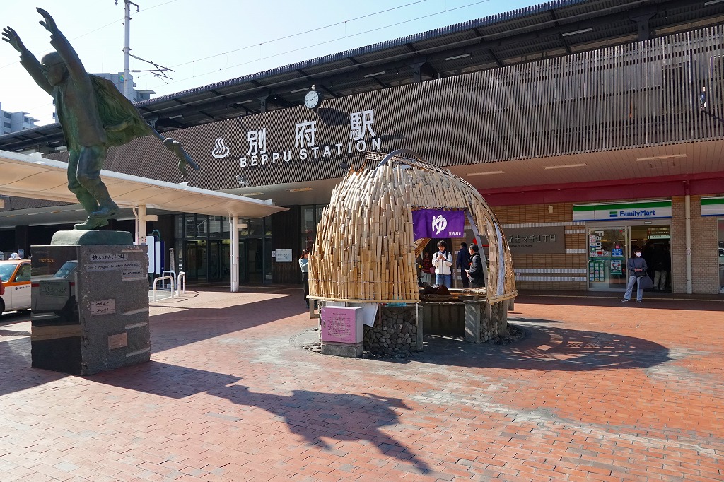 博多から特急列車「ソニック」で約2時間。別府市は大分県の中部で瀬戸内海の別府湾の奥に位置する、人口約11万人の温泉町。日本一の源泉総数と総湧出量を持ち、市街のいたるところで湯けむりが立ち上り、年に1000万人以上の観光客が訪れるほか、市民の生活は温泉とともにある。駅弁は1920(大正9)年から売られたが2007年に撤退、以後は駅の弁当売り場に、いくつかの業者による惣菜や新作駅弁が出たり消えたり。1911(明治44)年11月1日開業、大分県別府市駅前町。