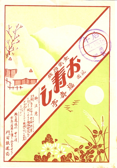 おそらく1930年代の調製と思われる、昔の延岡駅弁の掛紙。調製元の名前と駅名がなければ、どこの駅のものか分からないくらい、一般的な絵柄と記載事項でできている。調製元の福寿亭は臼井福松が1923年に構内営業を認められた、延岡駅前の料理屋の屋号で、1957年に廃業し梅の家へ引き継がれたという。