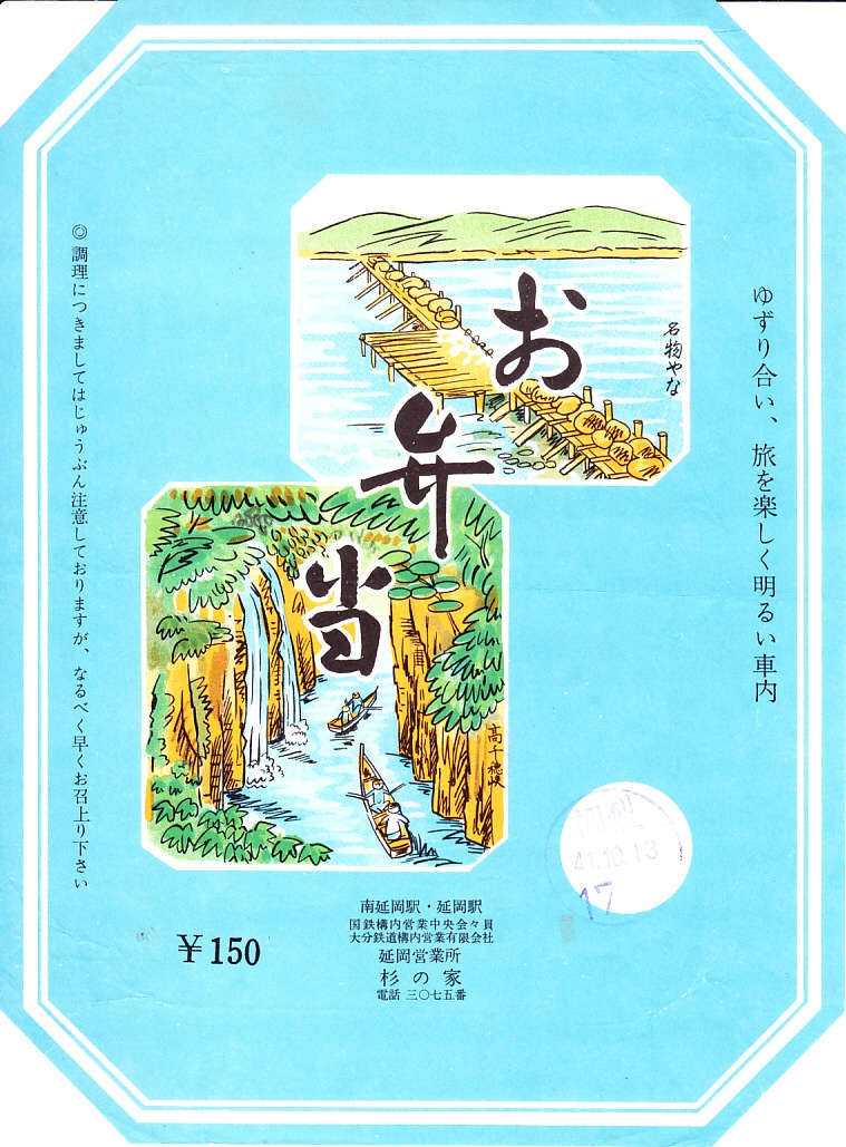 1966(昭和41)年10月13日17時の調製と思われる、昔の延岡駅弁または南延岡駅弁の掛紙。名物やなと高千穂峡を描く。延岡水郷鮎やなは今も延岡市内の五ヶ瀬川で、100メートルを超える川幅に10月から12月まで毎年設置されるという。