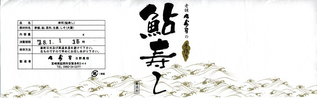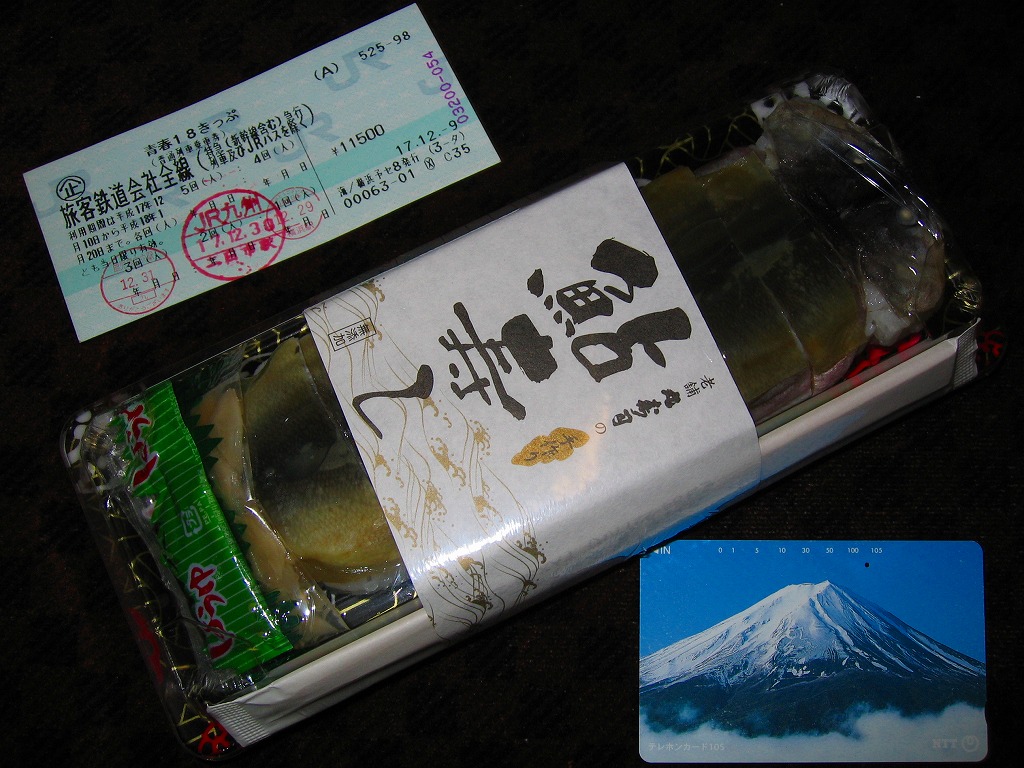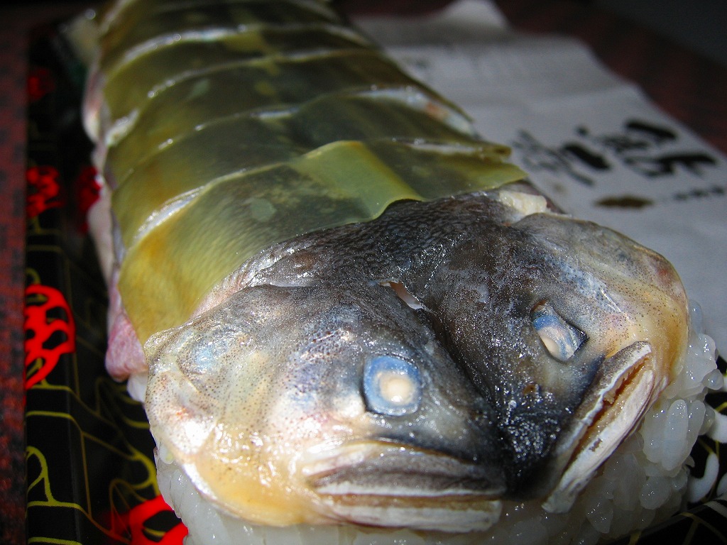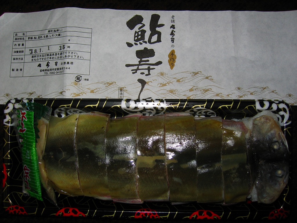 延岡駅のコンビニで買えた商品。スーパーの惣菜向けなプラ製トレーに、鮎の姿寿司をひとつ、酢飯に大葉とアユの開きと昆布を貼り付けて8切れにカットしたものが横たわる。鮎は延岡の名物でもあり、かつて延岡駅が公式な駅弁販売駅であった1990年代まで、ここには鮎ずしの駅弁があったため、その後継品であるように感じた。今は駅では売られていない模様。